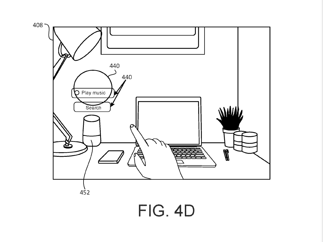 Te dane wizualne umożliwiają interakcję z inteligentnymi urządzeniami w pokoju za pomocą śledzenia dłoni w celu odbierania gestów. Rysunki przedstawiają szereg przykładów, takich jak sterowanie głośnikiem Nest, z opcjami odtwarzania muzyki lub wyszukiwania. Można również użyć urządzenia do noszenia, aby otworzyć aplikację na smart TV lub dostosować ustawienia termostatu Nest. Inne zastosowania mogą obejmować włączanie i wyłączanie świateł oraz interakcję z wyświetlaczami, takimi jak Nest Hub Max.