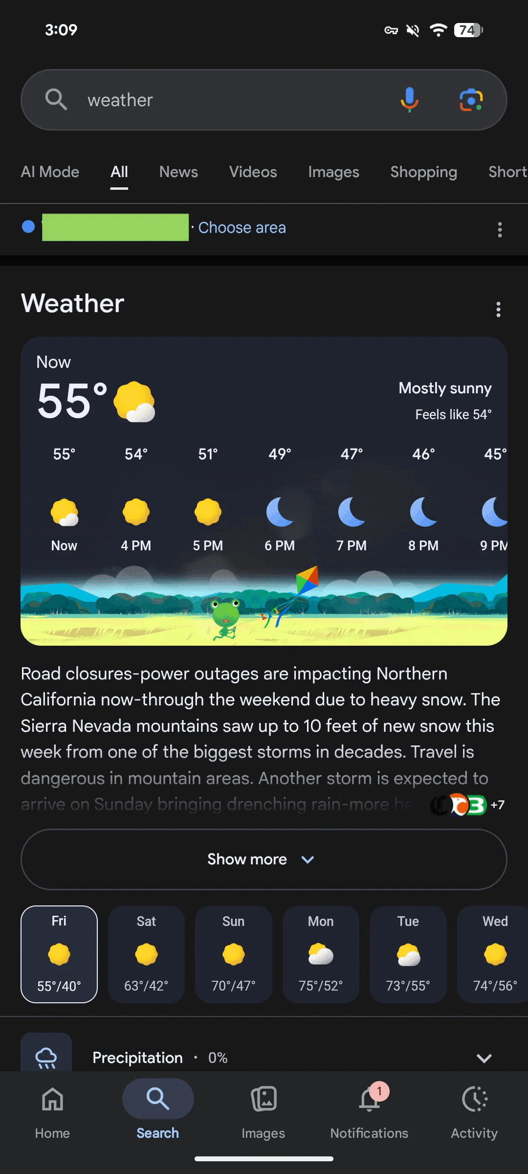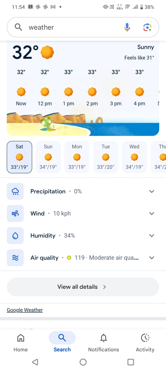 Stuknięcie skrótu Pogoda na ekranie głównym przenosi teraz użytkowników do strony wyników pogodowych wyszukiwarki Google, która wyświetla dane prognozy ze znajomą kartą tła Froggy, wraz z podsumowaniem pogody AI, standardową 10-dniową karuzelą prognoz i rozwijanymi menu jakości powietrza, wilgotności, wiatru i opadów.