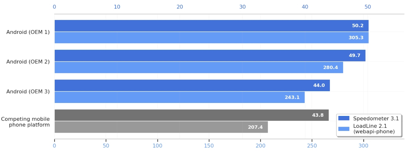 Speedometer to wspólny projekt Apple, Google i Mozilli, który symuluje typowe zadania użytkownika, takie jak klikanie przycisków w celu przeglądania i przewijania, aby zmierzyć "szybkość" przeglądarki. Wyniki benchmarków udostępnione przez Google pokazują, że nienazwane flagowe telefony Android wyprzedzają najnowsze telefony z "konkurencyjnej platformy telefonii komórkowej" (czytaj: iOS).