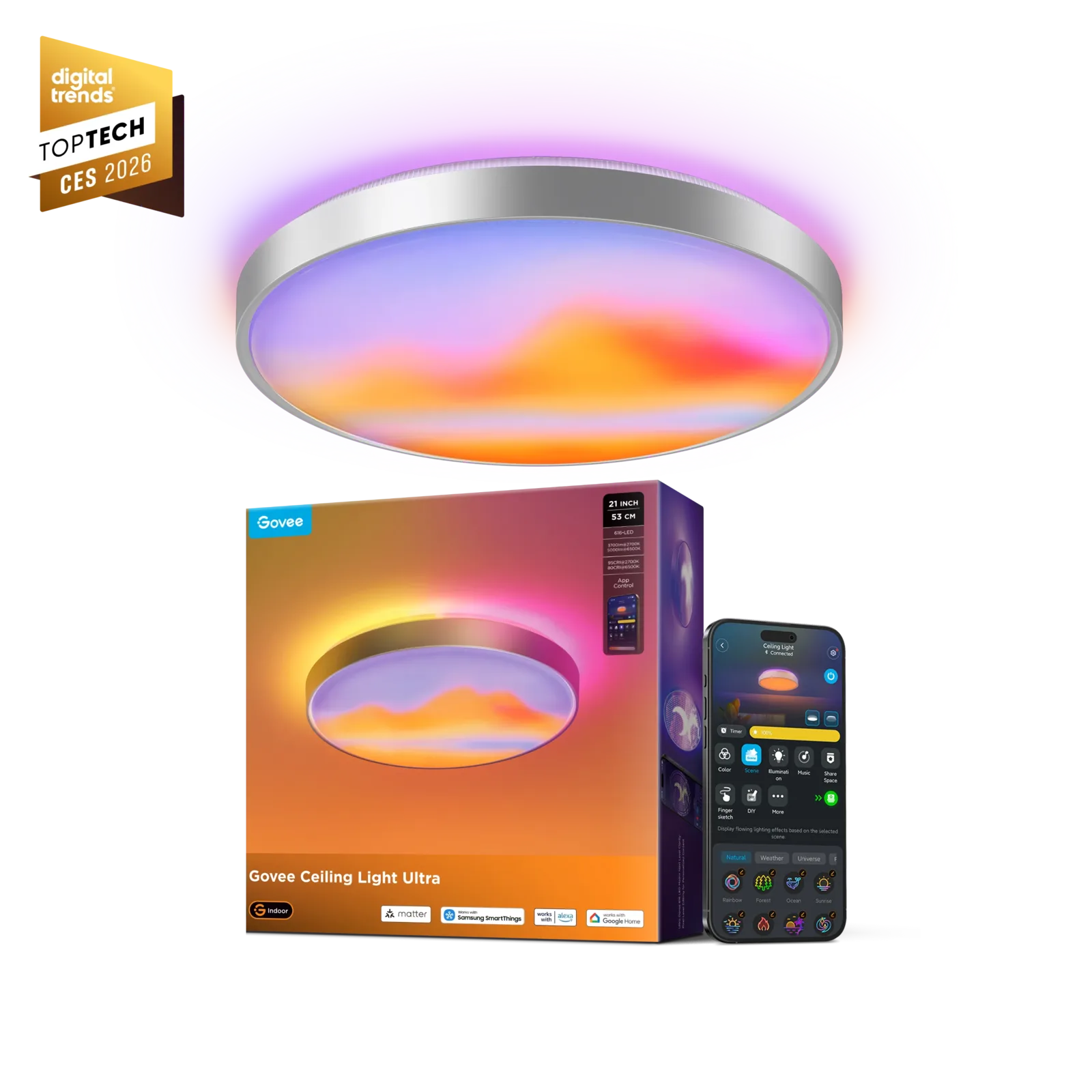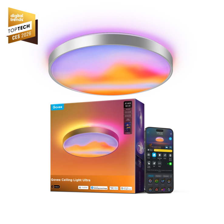 Alternatywnie, 21-calowa inteligentna lampa sufitowa Govee Ultra może być również używana jako konwencjonalna lampa pokojowa i według producenta zapewnia szczególnie naturalne oświetlenie, w tym regulację w zależności od pory dnia. Jasność sięga nawet 5000 lumenów. Nowa inteligentna 21-calowa lampa sufitowa Ultra od Govee oferuje również znaną producentowi łączność z inteligentnym domem, w tym Matter, a także sterowanie głosowe za pośrednictwem Amazon Alexa i Google Home.