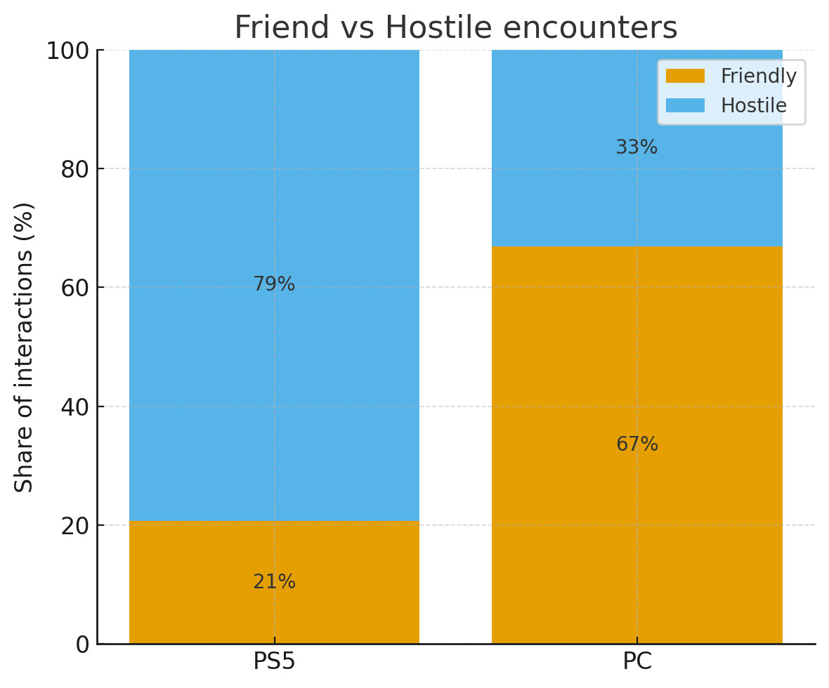 Strona PC wyglądała zupełnie inaczej. W ciągu 51 rund i 172 spotkań liczba przyjaznych interakcji prawie się odwróciła. Dziewięćdziesięciu ośmiu graczy życzyło powodzenia użytkownikowi PC, a 17 pozostało przyjaznych podczas ekstrakcji. To nie tak, że wrogie spotkania zniknęły - 47 nadal strzelało na widoku, a 7 kłamało przed atakiem - ale ogólny udział wrogich interakcji pozostał niższy niż odnotowany na PS5. Para wspomniała również, że ich próby komunikacji - rozmowa, wymiana przedmiotów lub sugerowanie krótkich team-upów - były przyjmowane znacznie bardziej otwarcie na PC. Na PS5 brat powiedział, że ostatecznie przestawił się na cichszy, bardziej ostrożny styl gry, ponieważ prawie każde spotkanie prowadziło do natychmiastowego konfliktu.