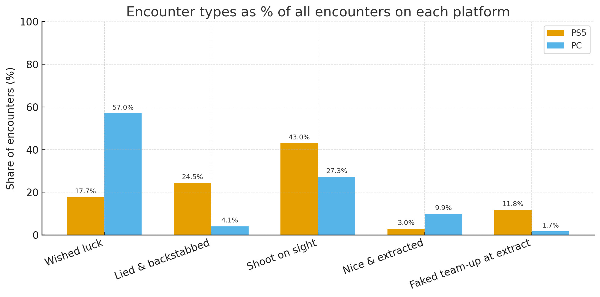 Gracz PS5 rozegrał 84 rundy i spotkał 237 graczy. Duża część tych spotkań była wroga. Spośród wszystkich graczy, których spotkał, 102 strzeliło od razu. Kolejnych 58 udawało, że współpracuje, zanim wykonało dźgnięcie w plecy. Przyjazne interakcje miały miejsce, ale były dość ograniczone - tylko 42 życzyło mu szczęścia, a 7 trzymało się razem wystarczająco długo, aby wydostać się jako drużyna. Nawet próby krótkich team-upów często kończyły się kiepsko, a 28 graczy udawało współpracę, zanim stali się wrodzy w strefie ekstrakcji.