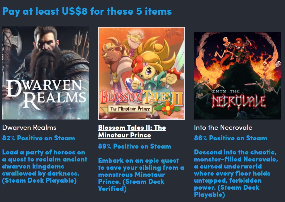 - Blossom Tales II - The Minotaur Prince: W tej przygodowej grze akcji wcielamy się w postać Lily. Naszym celem jest powstrzymanie powracającego Króla Minotaurów i uratowanie brata. Wraz z głównym wątkiem fabularnym i zadaniami pobocznymi, gracze mają do dyspozycji około 15 godzin rozgrywki. Gra kosztuje 14,99 dolarów na Steam, a 90% z 200 recenzji jest pozytywnych.