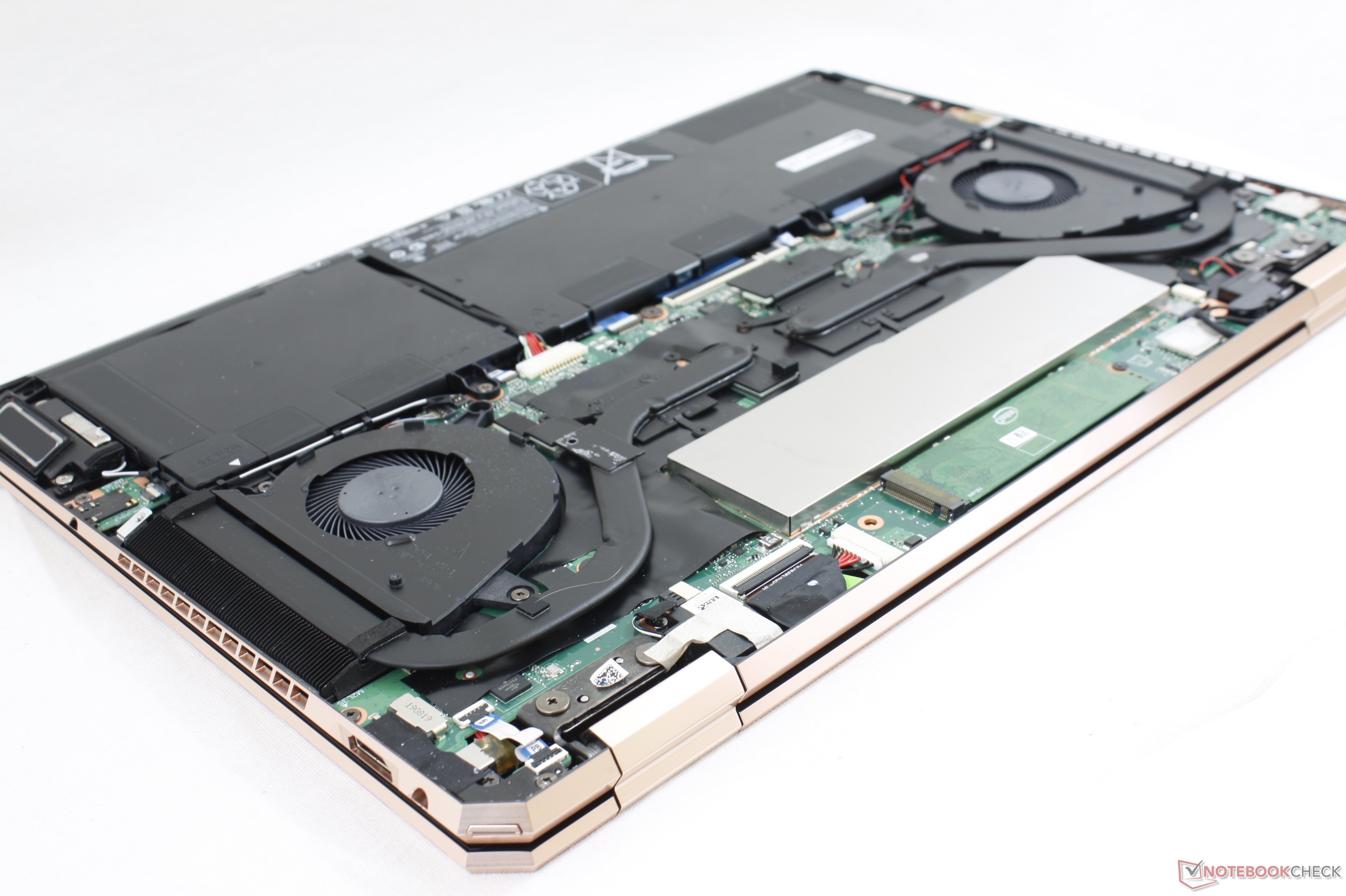 Najnowszy Spectre X360 15 potrafi być bardzo cichy ale i odmienić przyjazne dla ucha oblicze. Błoga cisza panuje tak długo, jak komputer pracuje pod małym lub średnim obciążeniem (edytor tekstu, przeglądarka, itp.). Podczas grania lub montażu materiału wideo wentylatory generują natomiast szum o zmiennej charakterystyce, który jest wysoce irytujący. W teście gry Wiedźmin 3 natężenie tego szumu miało wartość 39,7 dB(A) w teście pełnego pełnego obciążenia osiągnęło 42 dB(A).