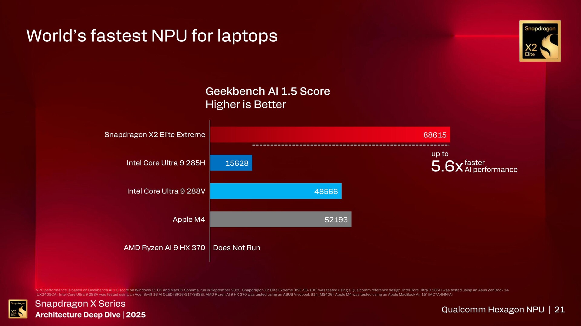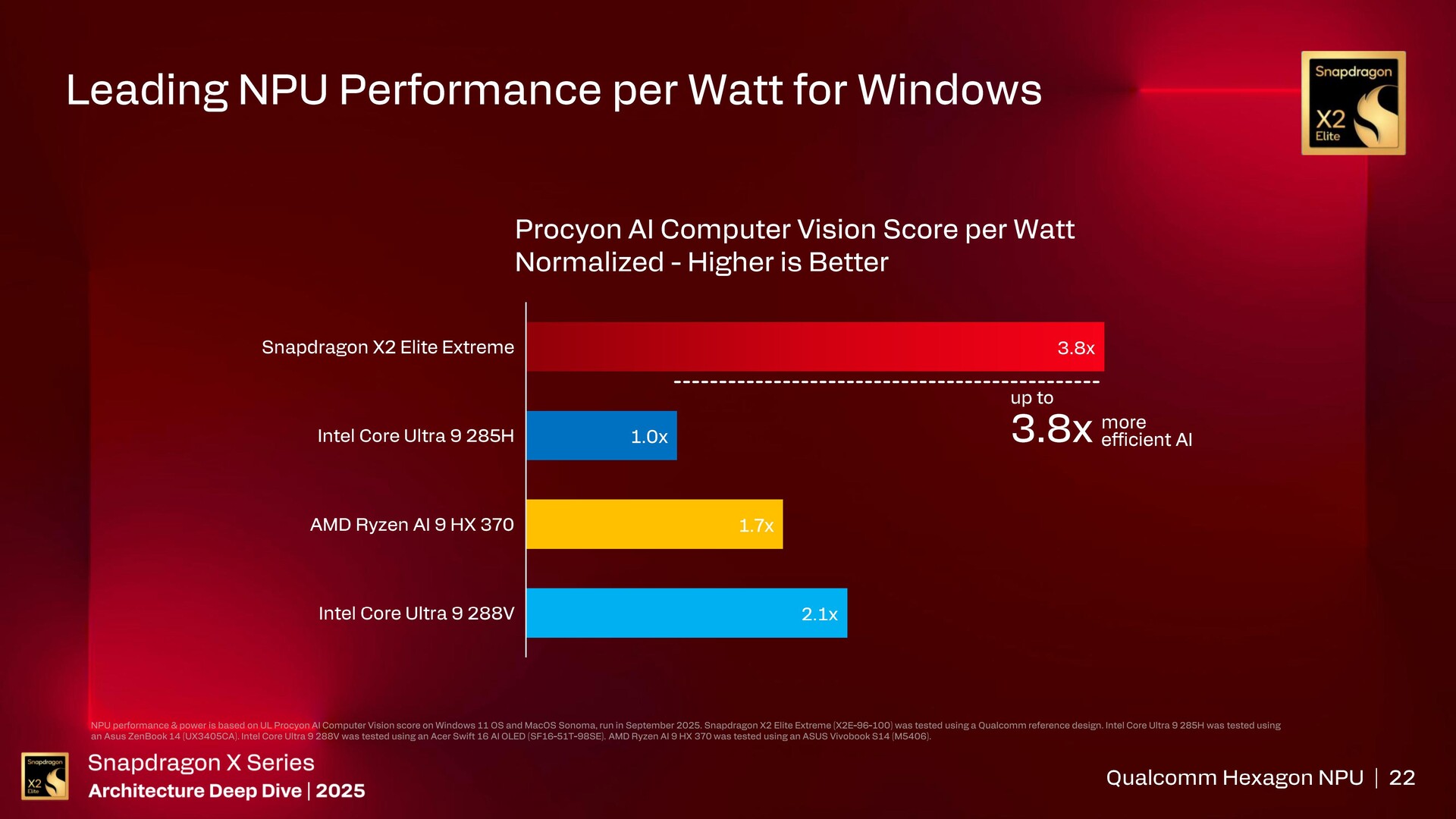Qualcomm reklamuje Hexagon NPU 6 w Snapdragon X2 Elite Extreme jako najszybszy na świecie, z nawet 5,7-krotnie wyższą wydajnością i 3,8-krotnie wyższą wydajnością w porównaniu do Core Ultra 9 285Hw Procyon AI Computer Vision.