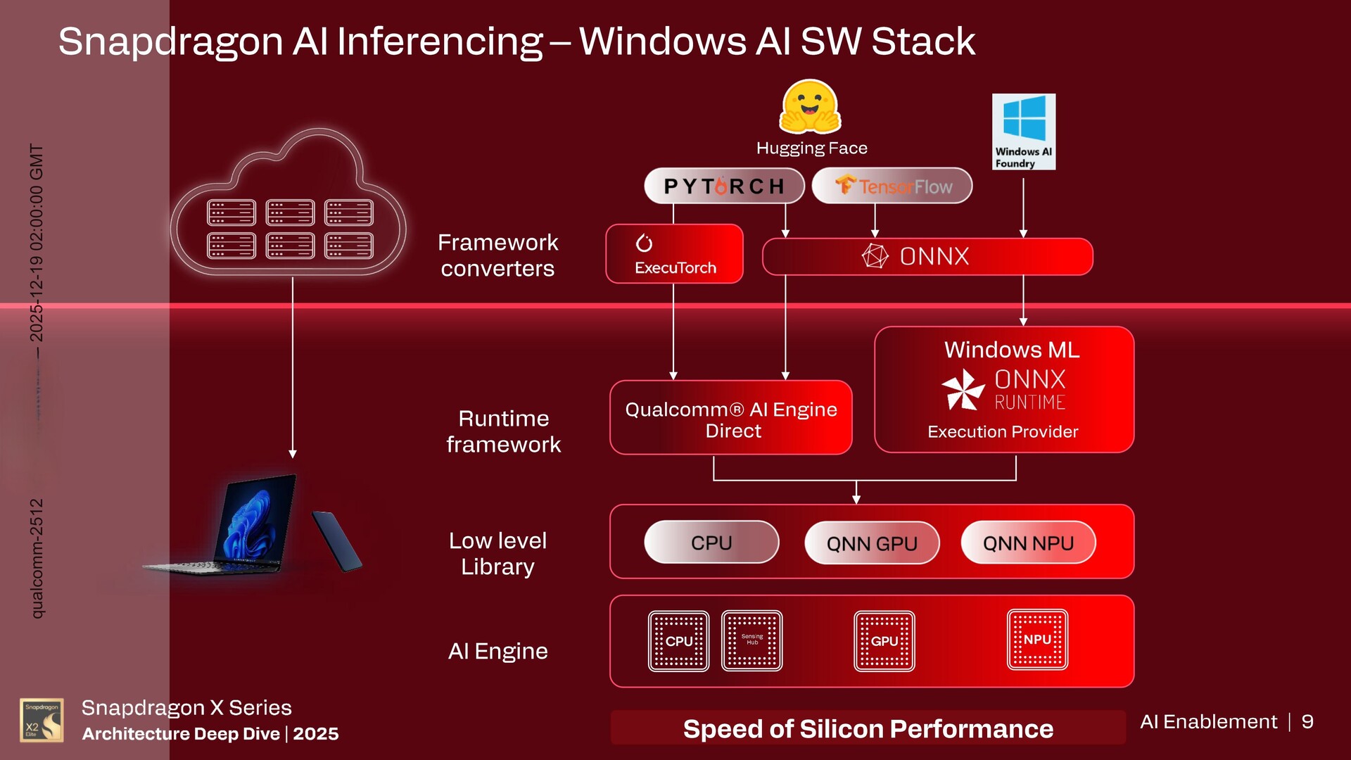 Wraz z ONNX Runtime oferowanym przez Windows ML, wnioskowanie Snapdragon AI może angażować CPU, GPU i NPU w celu przyspieszenia przetwarzania AI na urządzeniu.