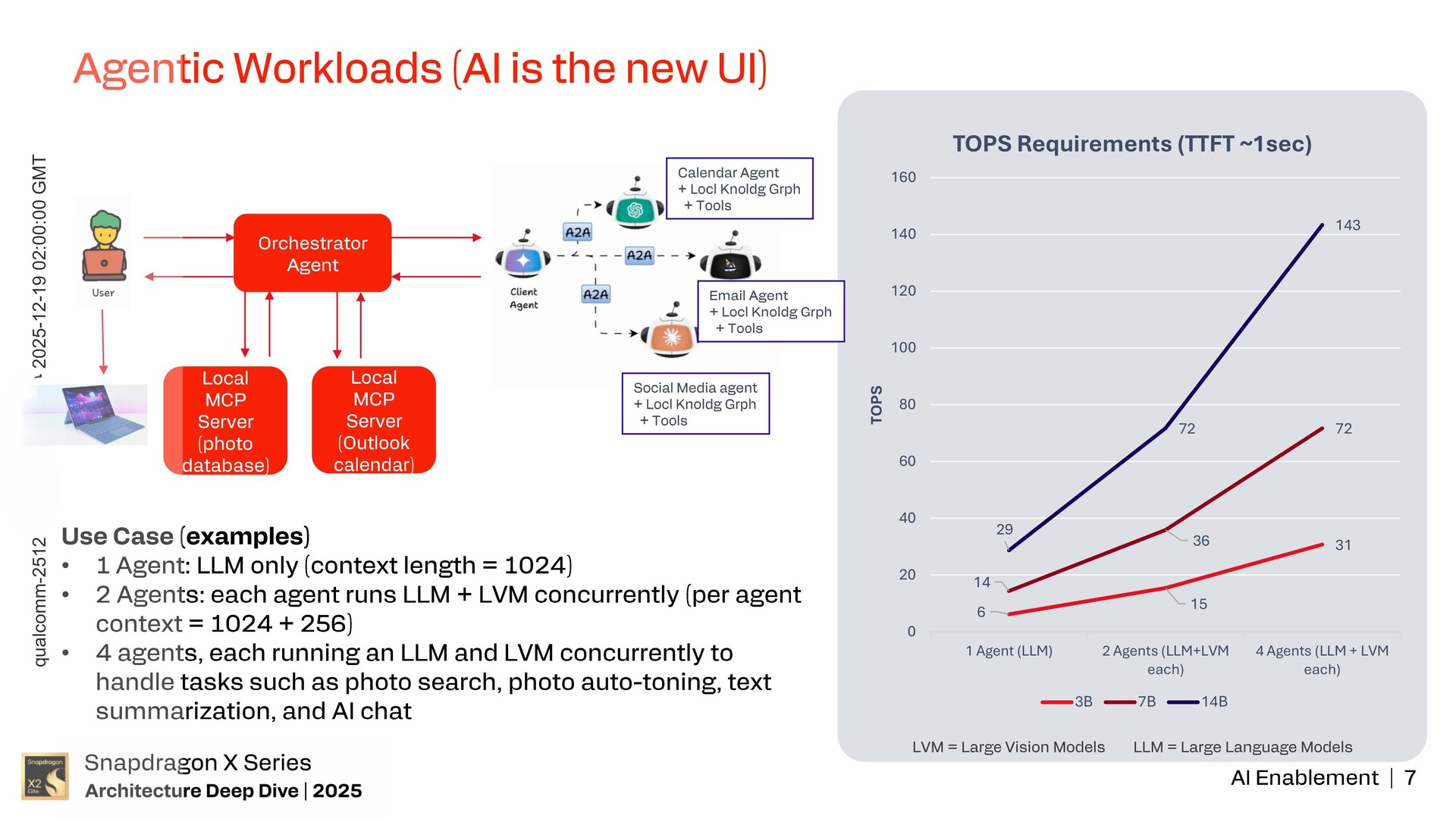 Qualcomm podkreślił, że pojedynczy agent LLM o długości kontekstu 1024 i 14 miliardach parametrów (14B) wymagałby do 143 TOPS mocy obliczeniowej AI, podczas gdy przypadki użycia agentów z dwoma (3B) lub czterema agentami (7B), z których każdy działa jednocześnie LLM i LVM, mogą wymagać do 72 TOPS.
