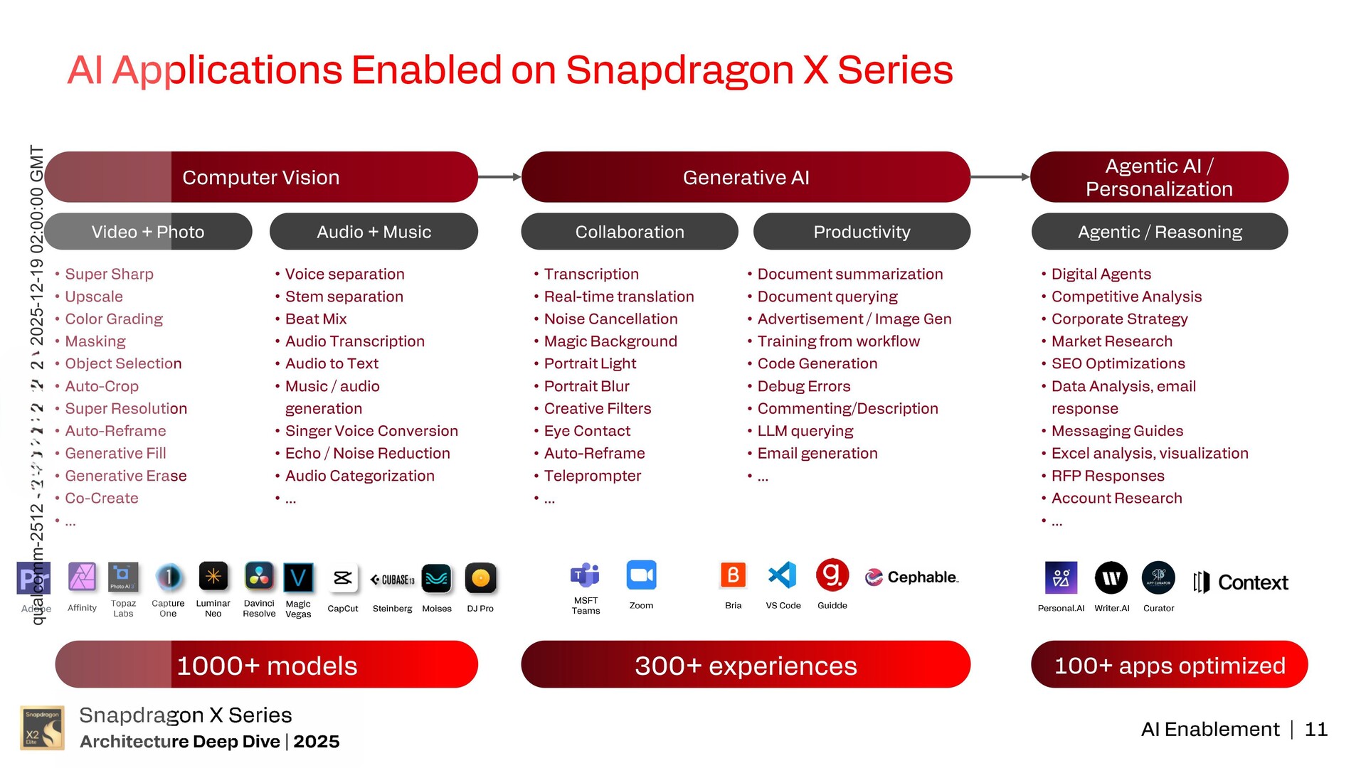 Laptopowe procesory SoC z serii Snapdragon X obsługują obecnie ponad 1000 modeli i ponad 300 doświadczeń obejmujących audio, wideo, zdjęcia, generatywną sztuczną inteligencję, agentową sztuczną inteligencję i wnioskowanie.