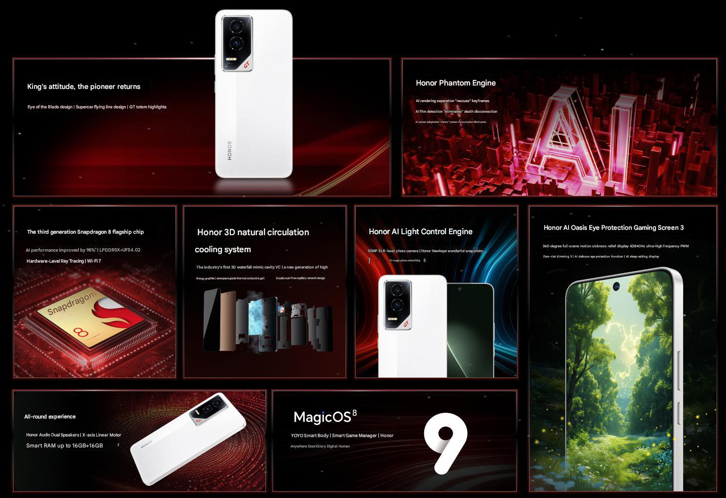 Co więcej, urządzenie zawiera baterię o pojemności 5,300 mAh, która obsługuje przewodowe ładowanie 100 W w celu szybkiego doładowania po długiej sesji grania. W międzyczasie, Honor GT posiada również optycznie stabilizowany aparat główny o rozdzielczości 50 MP, a także przedni aparat 16 MP i ultraszerokokątny aparat 12 MP. Nic dziwnego, że Honor zawiera również różne funkcje oprogramowania dla graczy, a także nowy system chłodzenia z komorą parową.