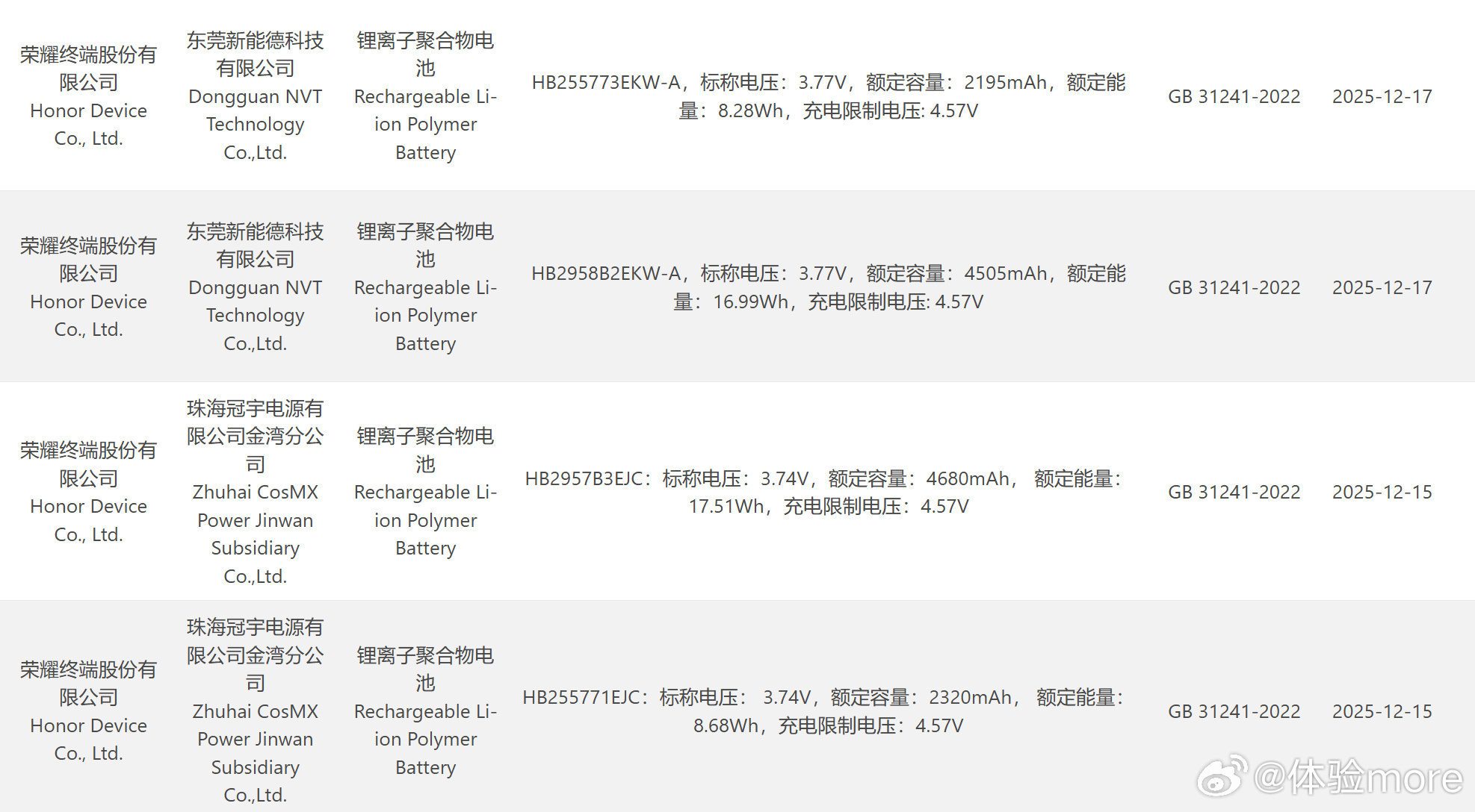 Teraz ten ostatni pojawił się w tym samym organie regulacyjnym. Wcześniej przecieki, takie jak Digital Chat Station sugerowali, że że prototypy Magic V6 osiągnęły baterie o pojemności 7000 mAh. Lista CCC wskazuje jednak, że jednostki detaliczne mogą być dostarczane z typową pojemnością baterii 7 150 mAh. Jeśli tak się stanie, zmiana ta stanowiłaby 17-procentową aktualizację pokoleniową między Magic V5 i Magic V6.