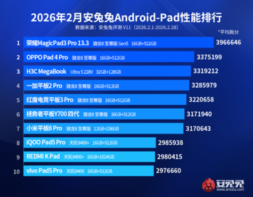 Na przykład, Honor MagicPad3 Pro prowadzi w rankingu tabletów. Został on wprowadzony na rynek pod koniec 2025 roku i jest wyposażony w Snapdragon 8 Elite Gen 5. Mówiąc dokładniej, jest to jedyne urządzenie na liście zasilane przez flagowy chipset Qualcomm obecnej generacji, co wyjaśnia jego dominację. Na drugim miejscu znajduje się Snapdragon 8 Elite-oppo Pad4 Pro, podczas gdy H3C MegaBook zajmuje trzecie miejsce dzięki swojemu Intel Core Ultra 5 228V. Ta tabela prawdopodobnie zmieni się w nadchodzących miesiącach, biorąc pod uwagę niedawny debiut tabletu Snapdragon 8 Elite Gen 5, takiego jak Lenovo Legion Tab Gen 5.