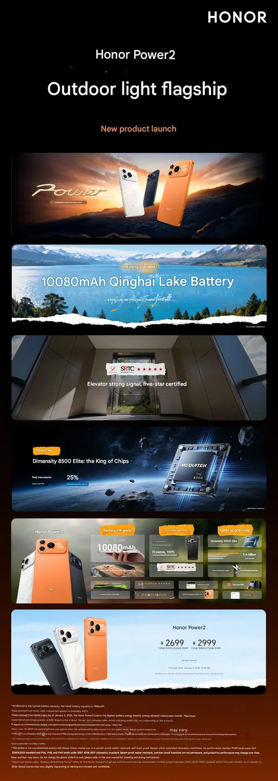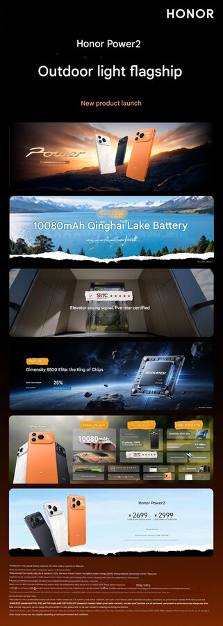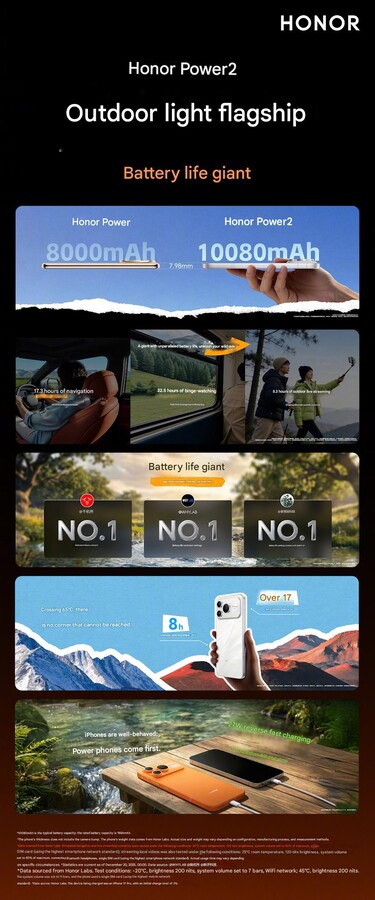 Honor nie może konkurować z Apple pod względem specyfikacji, z wyjątkiem baterii. Moduł baterii o pojemności 10 080 mAh w ultracienkim smartfonie o grubości 8 mm, w połączeniu z nowym chipsetem MediaTek Dimensity 8500 Elite klasy średniej, ma zapewnić 8,3 godziny ciągłego przesyłania strumieniowego na żywo, 32,5 godziny oglądania lub 17,3 godziny nawigacji. Mówi się również, że działa niezawodnie w ekstremalnie niskich temperaturach. Dzięki 27-watowemu ładowaniu wstecznemu, smartfon może być również używany jako power bank, a ogromna bateria może być ładowana z maksymalną mocą 80 watów.