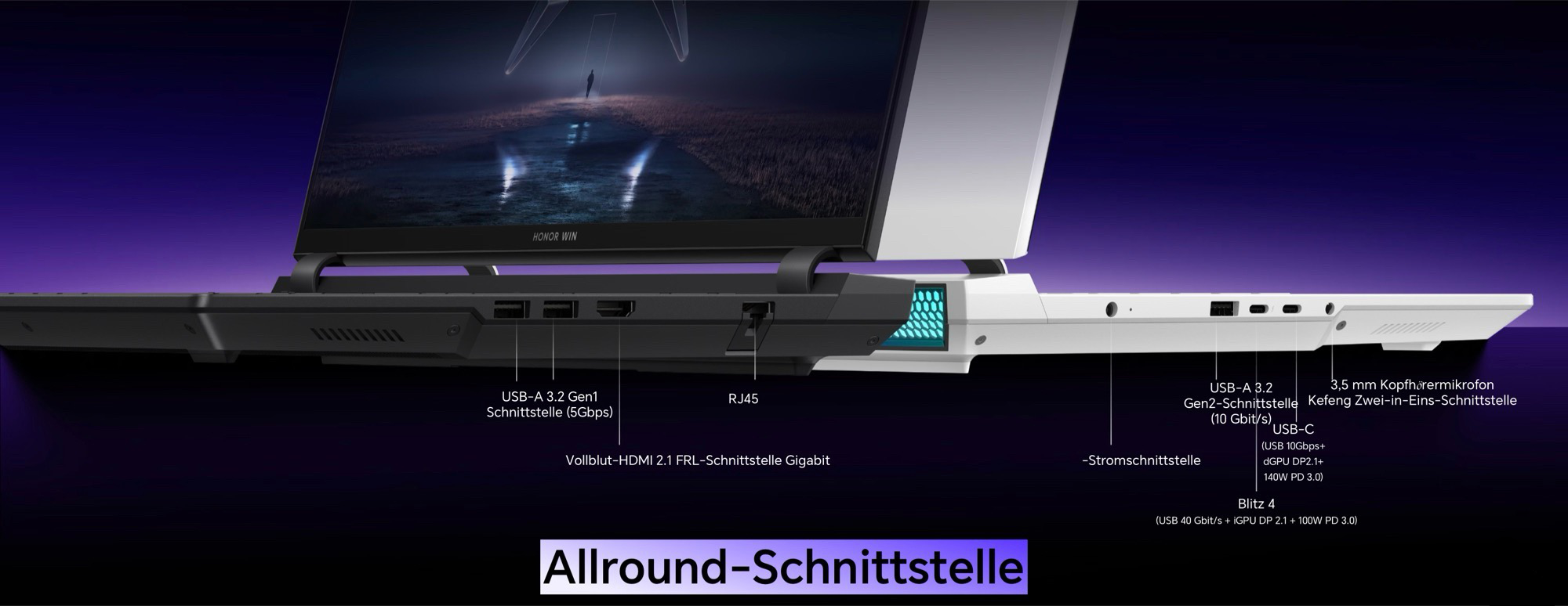 Z tego maksymalnie 140 watów jest przydzielane do Nvidia GeForce RTX 5070 Ti Laptop GPUreszta jest zużywana przez Intel Core Ultra 9 290HX Plus. Honor wykorzystuje 16-calowy panel IPS w formacie 16:10, który oferuje rozdzielczość 2560 x 1600 pikseli, jasność 500 nitów i częstotliwość odświeżania 300 Hz; zgodnie z Honor, przestrzeń kolorów DCI-P3 może być wyświetlana w całości. Bateria ma pojemność 92 Wh. Dzięki portom Thunderbolt 4 (USB-C), USB-C 3.2 Gen 2, trzem portom USB-A, HDMI 2.1 i Ethernet, laptop oferuje szeroką gamę połączeń.