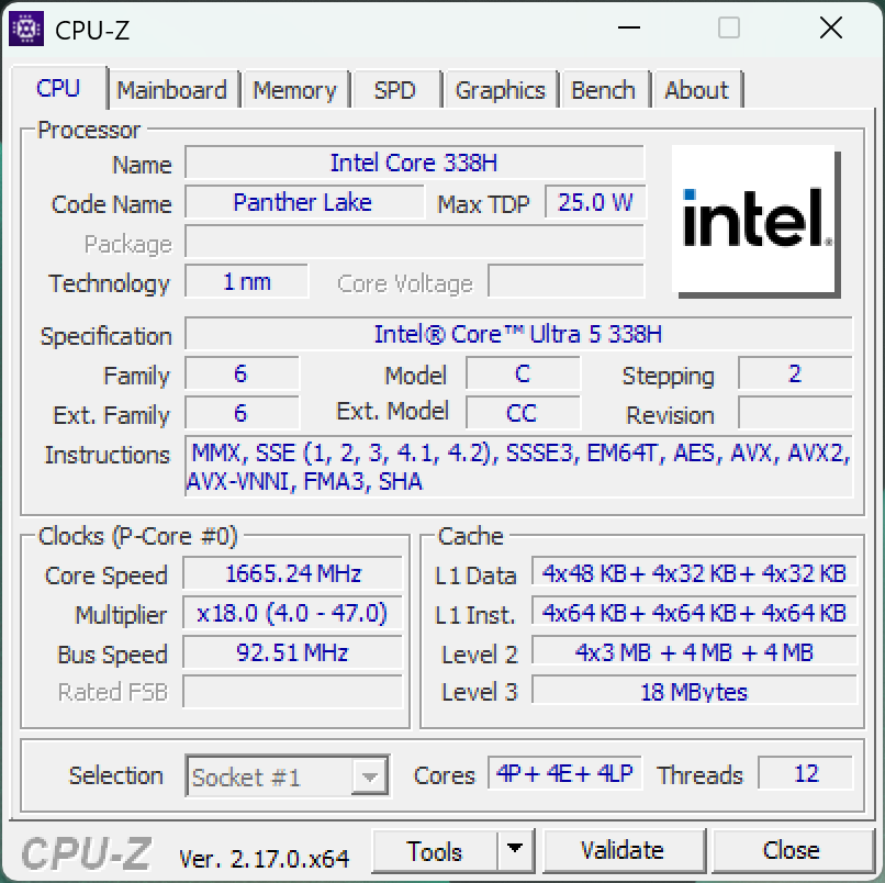 Nasz egzemplarz testowy został wyposażony w nowy procesor Intel Panther Lake Core Ultra 5 338H z 4 wydajnymi i 8 wydajnymi rdzeniami. Procesor zużywa do 65 W, a następnie spada do około 50 W, więc wydajność jest bardzo stabilna nawet przy długotrwałym obciążeniu. Ogólny poziom wydajności jest porównywalny do starego Core Ultra 7 255H. Wydajność nie spada na zasilaniu bateryjnym.