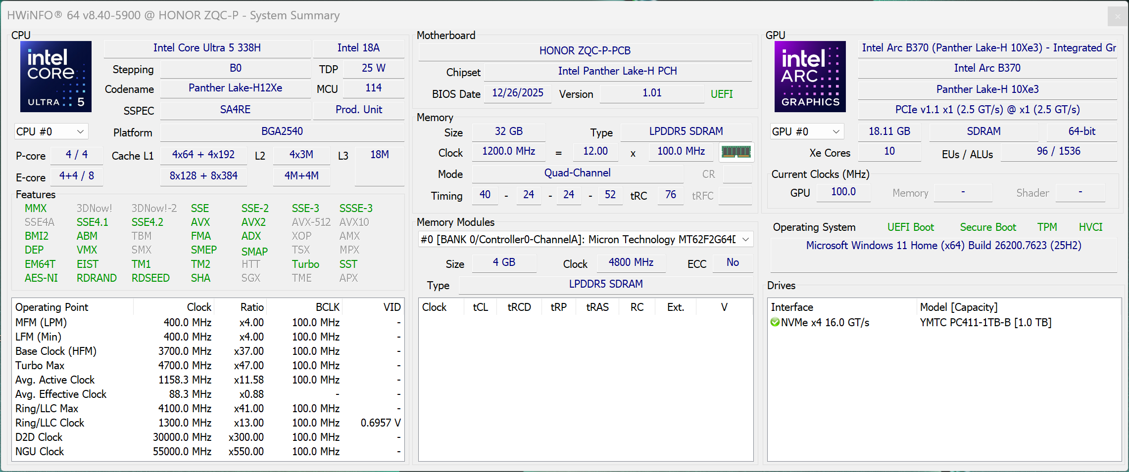 | Honor MagicBook Pro 14 2026 Intel Core Ultra 5 338H ⎘ Intel Arc B370 10 Xe3 Panther Lake iGPU ⎘ 32 GB Pamięć, 1024 GB SSD | Amazon: | 1.4 kg | 15.9 mm | 14.60" 3120x2080 257 PPI OLED | |