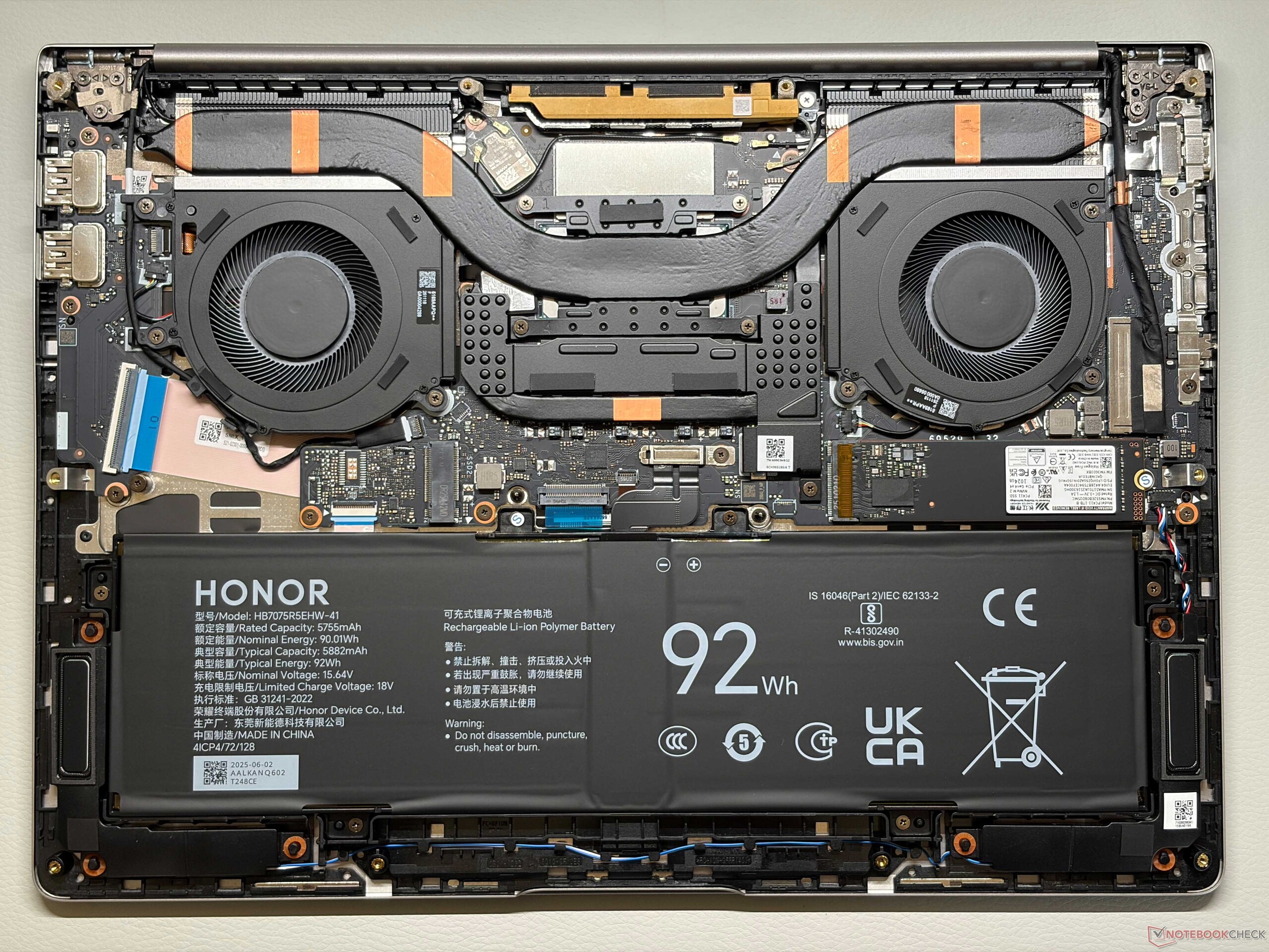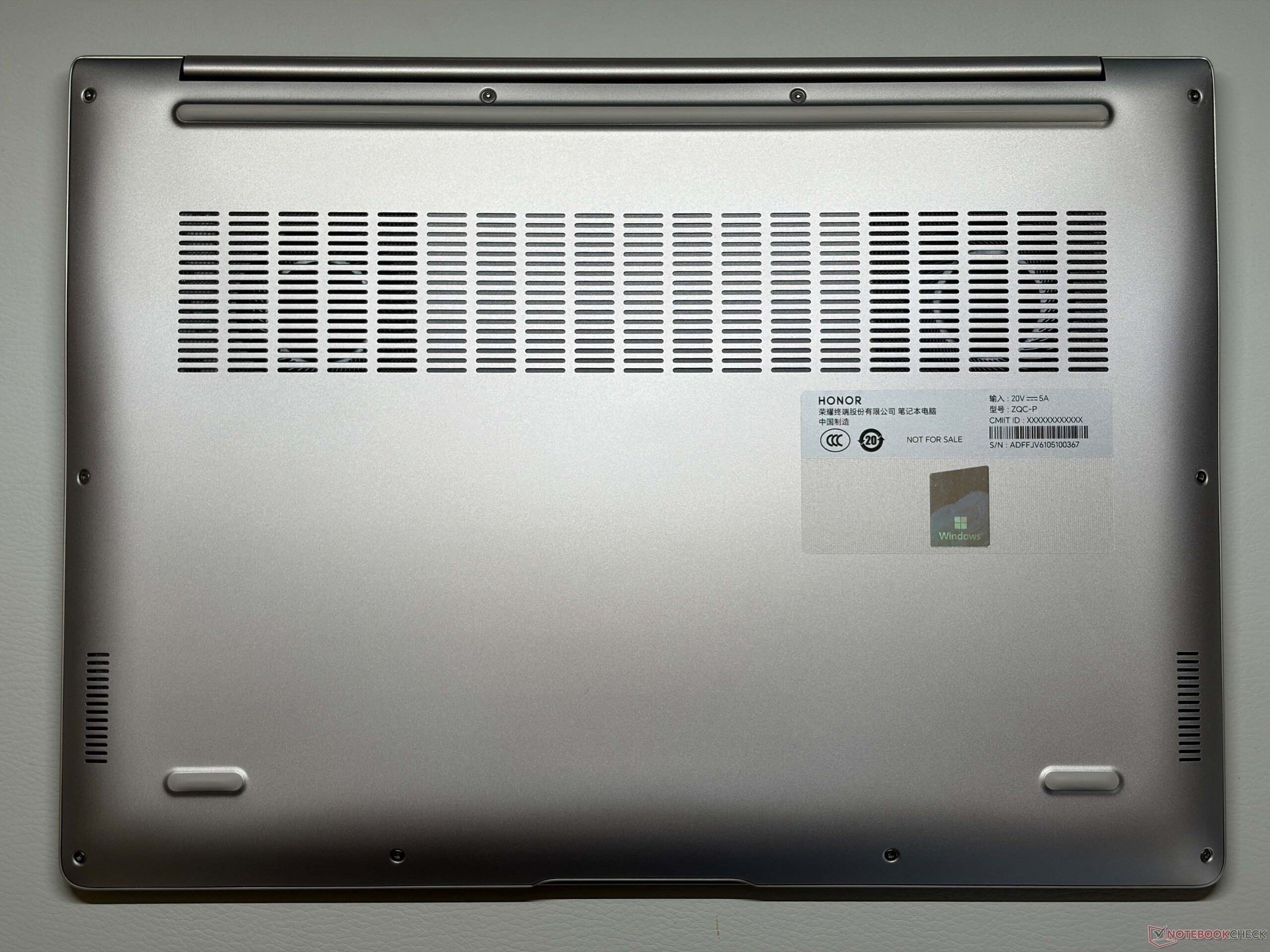 Honor w nowym modelu 2026 nadal wykorzystuje tę samą obudowę z poprzedniego MagicBook Pro 14. Metalowa obudowa dostępna jest w trzech wersjach kolorystycznych (gwiezdna szarość, zielony lub biały), a jej jakość wykonania pozostawia bardzo dobre wrażenie. Zarówno podstawa, jak i pokrywa są bardzo solidne, a zawiasy dobrze wyregulowane (maksymalny kąt otwarcia ~165 stopni). Pokrywę można łatwo otworzyć jedną ręką, ale mimo to nie ma zauważalnego chybotania. Dolny panel można łatwo zdjąć, ale konserwacja ogranicza się do wentylatorów, baterii oraz dwóch slotów na dyski SSD.