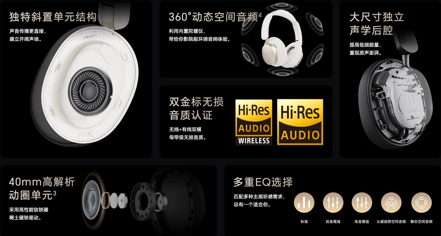 Jeśli chodzi o funkcje, słuchawki Honor Choice Codeler Headphones 2 są wyposażone w 40-milimetrowe przetworniki dynamiczne. Posiadają one również aktywną redukcję szumów (do 57 dB), dźwięk przestrzenny ze śledzeniem głowy i wsparcie dla Hi-Res Audio Wireless. Honor wspomina również, że użytkownicy mogą przełączać się między różnymi ustawieniami korektora.