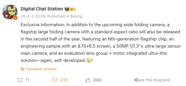 Co więcej, przeciek wspomina, że Huawei Mate X8 będzie zasilany przez "flagowy chip N-tej generacji", którym prawdopodobnie będzie Kirin 9040 Pro, następca Kirin 9030 Pro z Mate X7. Mówi się, że nadchodzący składany telefon będzie wyposażony w 50 MP 1/1,3-calowy duży czujnik dla głównego aparatu. To mniej więcej wszystkie informacje udostępnione przez leakera.