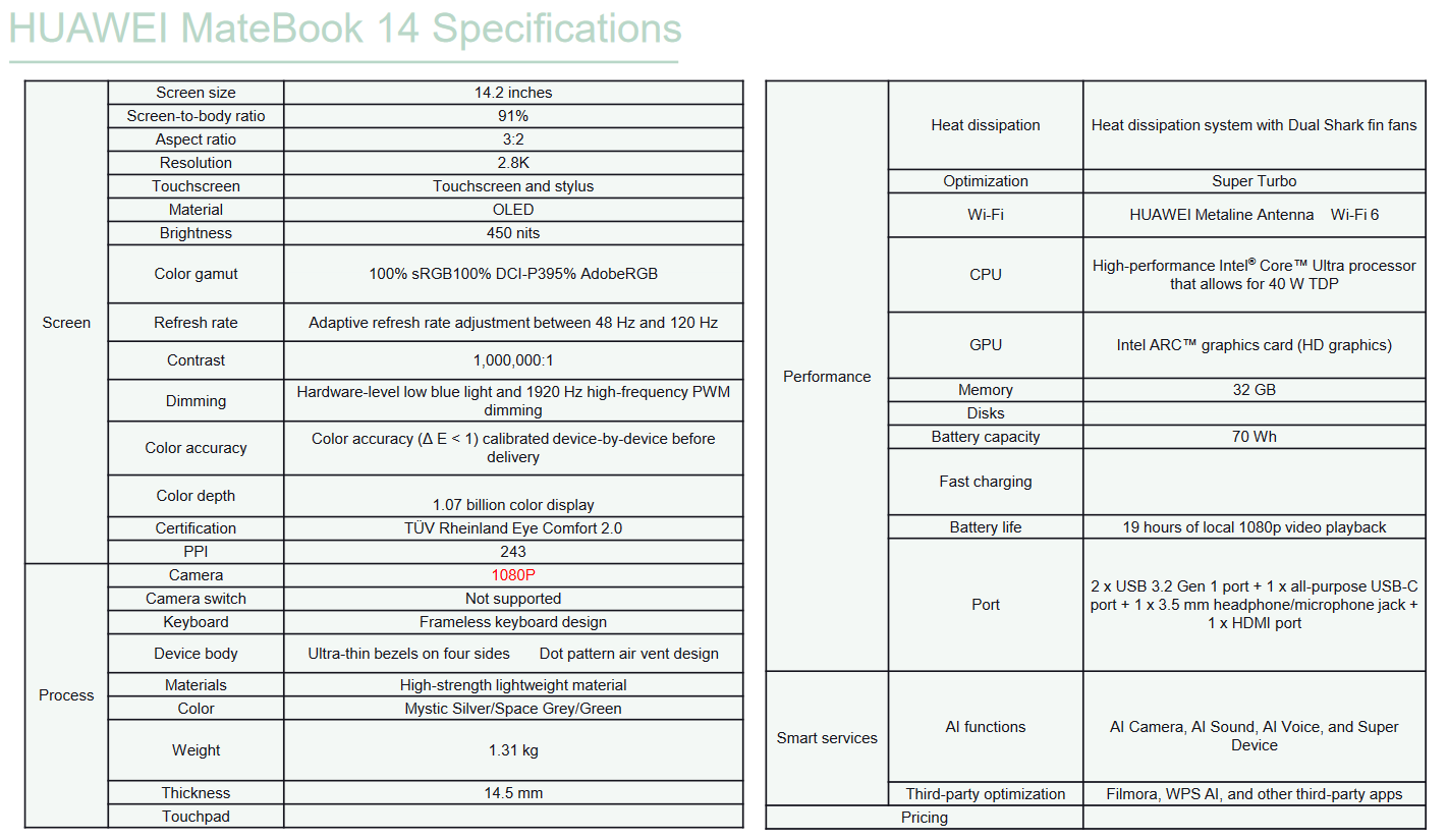 Niestety, Huawei nie określa, który procesor zasila MateBook 14 2024, po prostu stwierdzając, że wykorzystuje on jednostkę SKU Intel Meteor Lake, która "pozwala na TDP 40 W", co wskazuje na Core Ultra 9 185H. Jest on sparowany z iGPU Intel Arc, 32 GB pamięci RAM i nieznaną ilością pamięci masowej. Bateria o pojemności 70 Wh zasila laptopa, który obsługuje standardy USB PD, UFCS i zastrzeżony przez Huawei SuperCharge. W trybie gotowości można używać laptopa do ładowania urządzeń peryferyjnych z mocą do 40 W.