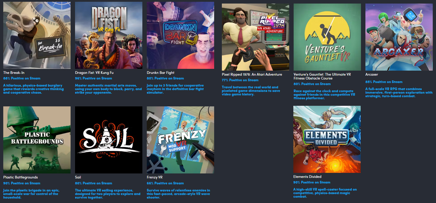 - The Break-In - grywalna zarówno w trybie VR, jak i standardowym, to czteroosobowa gra kooperacyjna gra kooperacyjna która polega na zabawnych włamaniach. Gra została wydana w 2025 roku i kosztuje 19,99 USD, a jej gracze oceniają ją obecnie bardzo pozytywnie.