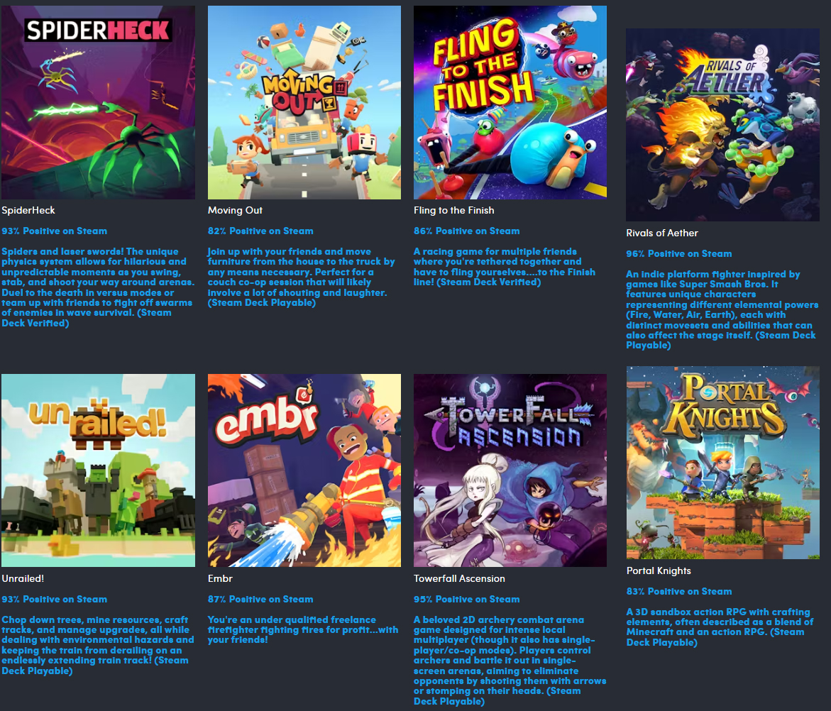 - Towerfall Ascension - lokalna gra imprezowa dla maksymalnie 4 graczy, która zdobyła wiele nagród. Jej cena wynosi 14,99 USD, posiada ona oznaczenie Steam Deck Playable i została wydana w 2014 roku.