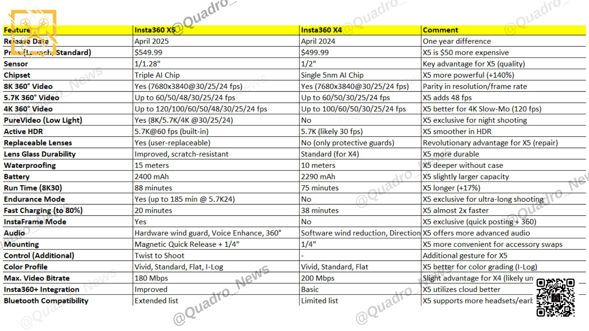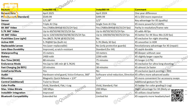 Opierając się na informacjach zawartych powyżej i poniżej, wydaje się, że Insta360 planuje zainstalować większy 1/1,28-calowy czujnik kamery z nawet o 133% lepszą wydajnością świetlną niż 1/1,2-calowy odpowiednik znajdujący się w Insta360 X4 Insta360 X4 (obecnie 424,99 USD na Amazon). Co więcej, Insta360 X5 powinien skorzystać z 17% poprawy pojemności baterii (2290 vs 2400 mAh) i prawie 50% szybszego ładowania.