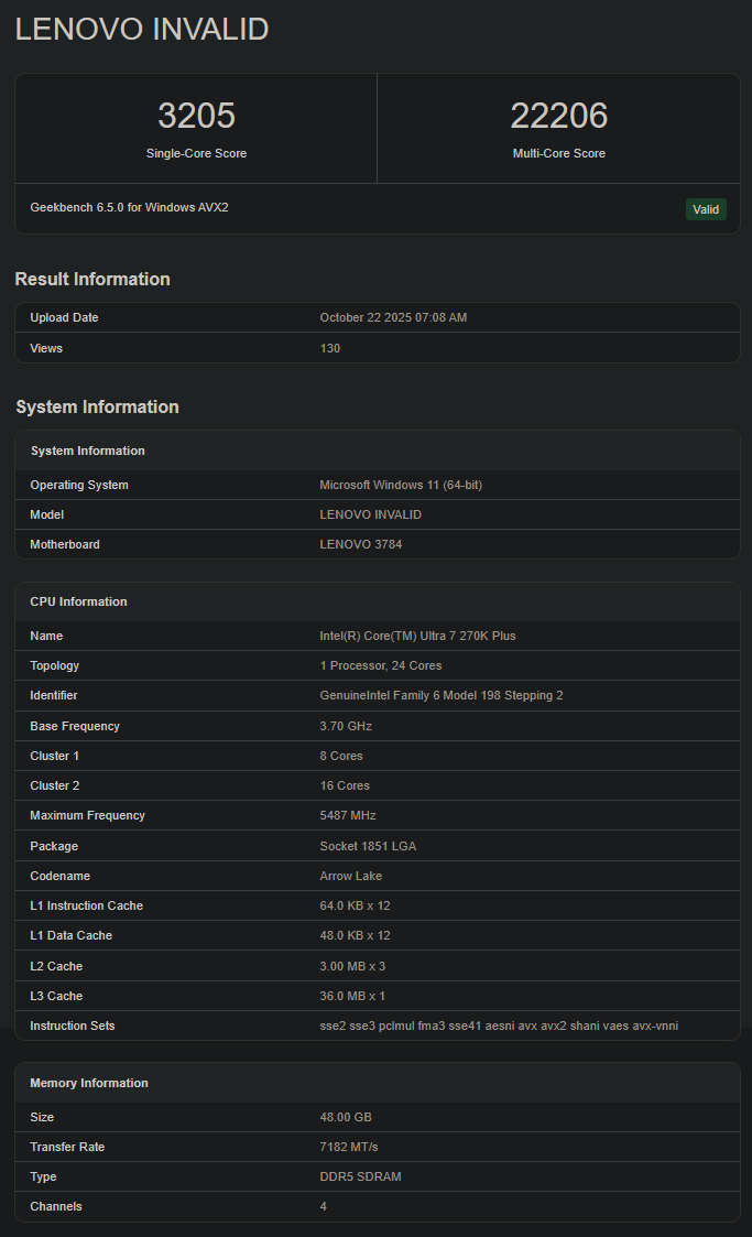 Uzyskał on wyniki 3,205 i 22,206 w testach Geekbench 6.5 odpowiednio w testach jedno- i wielordzeniowych. Core Ultra 7 270K Plus ma 24 rdzenie (8 P + 16 E), 24 wątki i zegar boost 5,4 GHz. Zasila on nieokreślony komputer Lenovo z 48 GB pamięci RAM DDR5-7182 (DDR5-7200) z systemem Windows 11. Back-end Geekbench ujawnia, że został on przetestowany wraz z GeForce RTX 5090 D, GPU dostępnym tylko w Chinach.