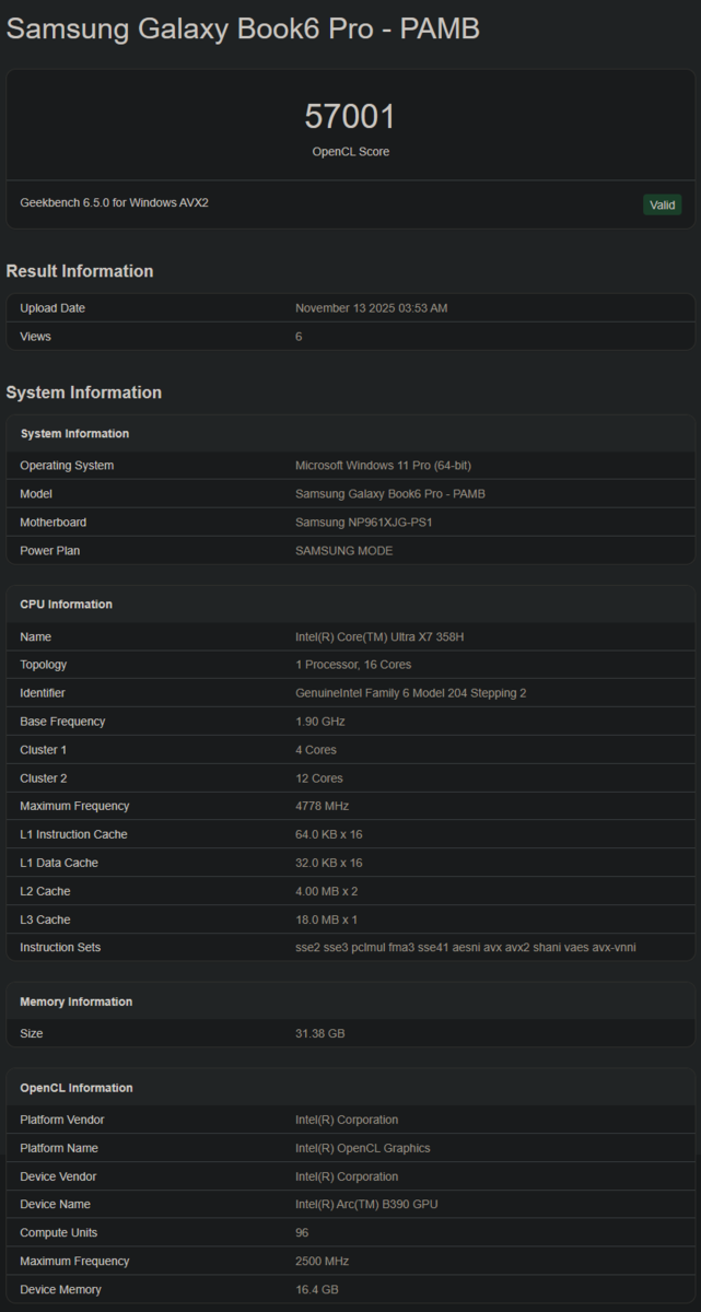 Laptop, o którym mowa, to nadchodzący Samsung Galaxy Book6 Pro. Alternatywny wariant z Core Ultra 5 338H wyciekł wcześniej z iGPU Arc B570. Ma 32 GB pamięci RAM, z 16 GB przydzielonymi do iGPU w tym przypadku. Oczekuje się, że pojawi się w przyszłym roku wraz z mocniejszym Galaxy Book6 Ultra.
