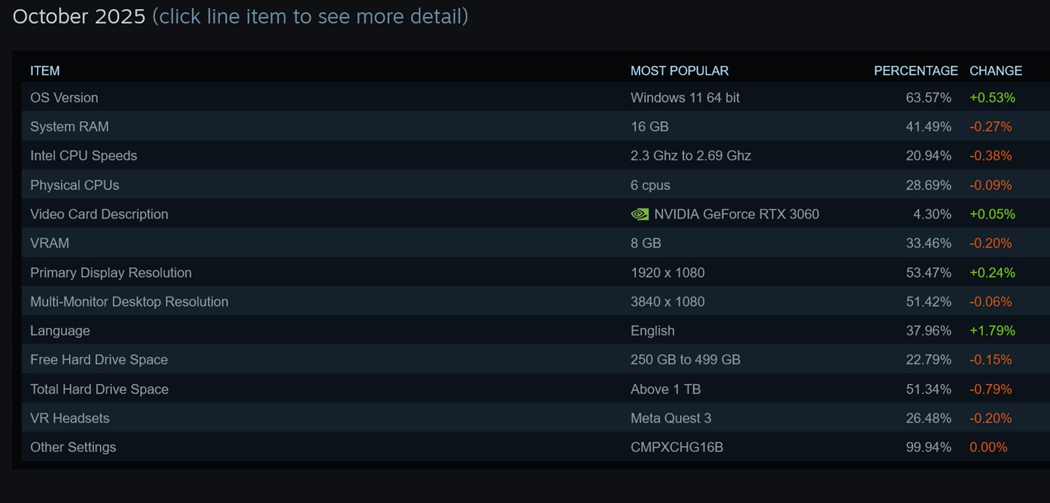 Aldehayyat wygłosił swoje komentarze podczas niedawnego podcastu Adama Savage'a Tested. Dane sprzętowe śledzone przez Valve wydają się potwierdzać jego twierdzenia. Jednym z zmartwień kupujących jest 8 GB pamięci VRAM w pół-niestandardowym GPU AMD RDNA 3 Steam Machine. Jednak 33,46% w październikowej ankiecie https://store.steampowered.com/hwsurvey/ta pojemność pamięci odpowiada najpopularniejszej konfiguracji.
