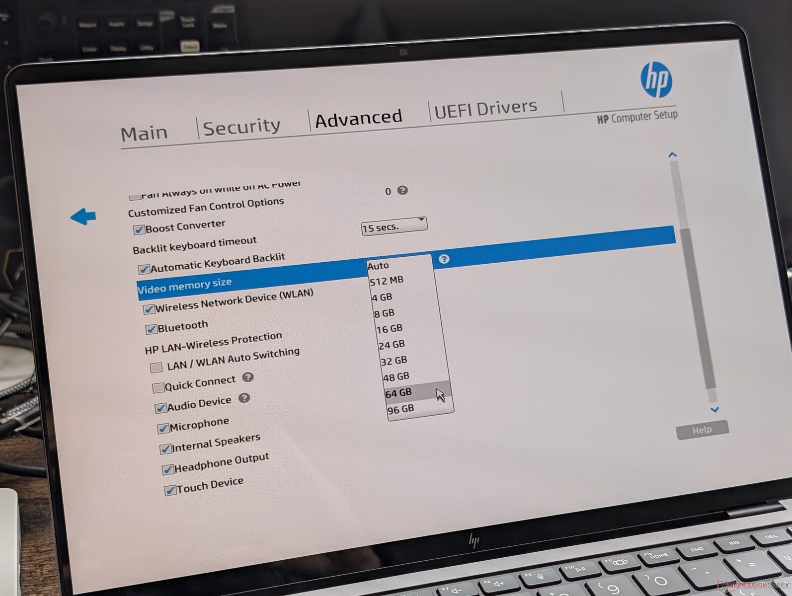 Aby uzyskać dostęp do tej funkcji, mamy wspomniany wcześniej HP ZBook jako naszą przykładową jednostkę testową. Naciśnięcie "Esc" podczas uruchamiania systemu inicjuje "Menu startowe", jak pokazano na poniższym obrazku. Stamtąd użytkownicy muszą wejść do "BIOS Setup", przewinąć do zakładki "Advanced", a następnie wybrać "Video memory size". Funkcja ta jest domyślnie ustawiona na 64 GB, ale dostępne są opcje od 512 MB aż do 96 GB.