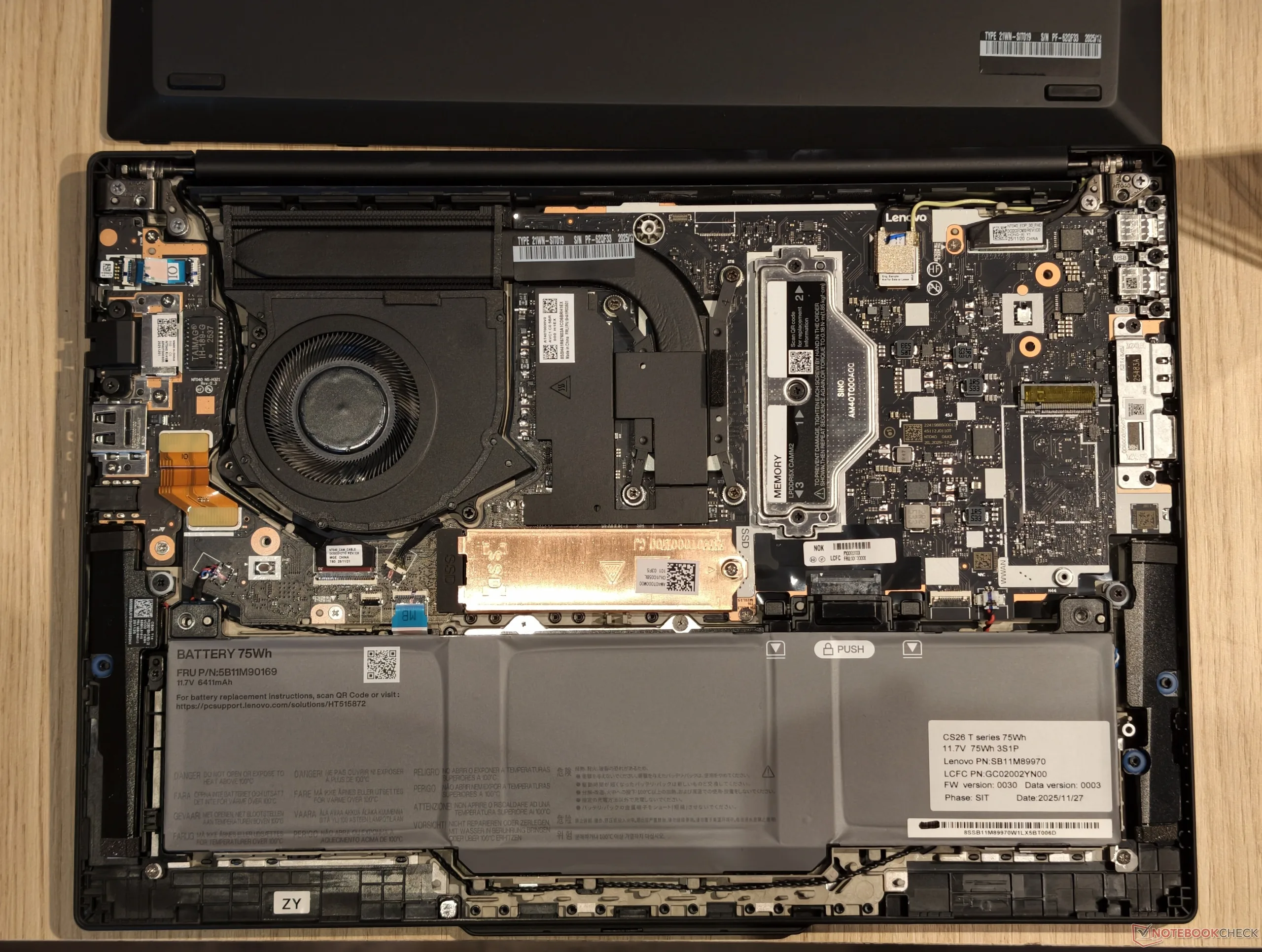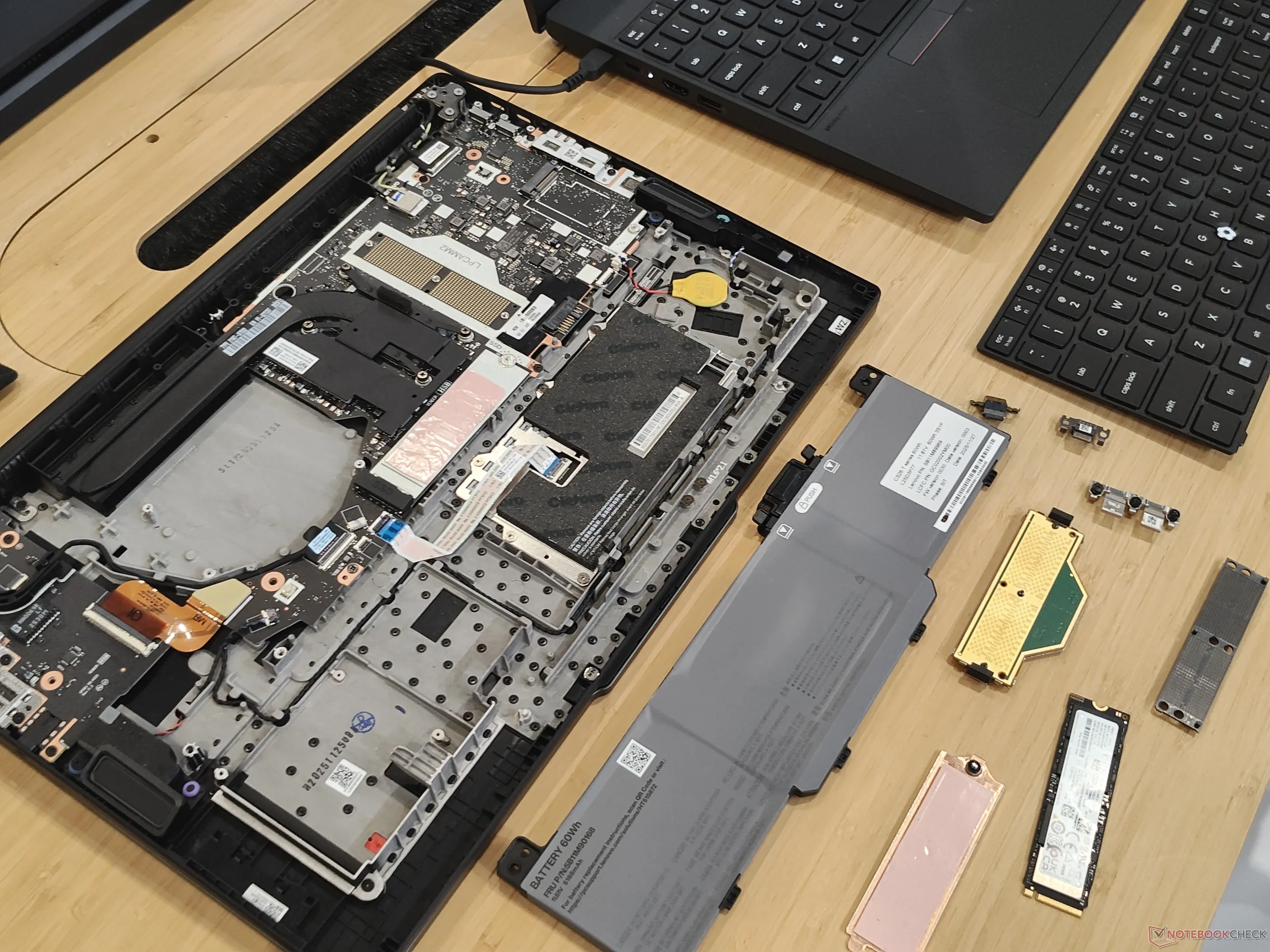 Lenovo mogło zdecydować się na lutowanie pamięci LP RAM, ale zdecydowało się na LPCAMM2, ponieważ jest to modułowe, naprawialne rozwiązanie. Ogólnie rzecz biorąc, seria ThinkPad T przyjęła to jeszcze bardziej niż wcześniej, ponieważ nie tylko pamięć RAM jest modułowa. Po zdjęciu dolnej pokrywy baterię można wyjąć, naciskając dwie małe wypustki zwalniające, bez użycia narzędzi.