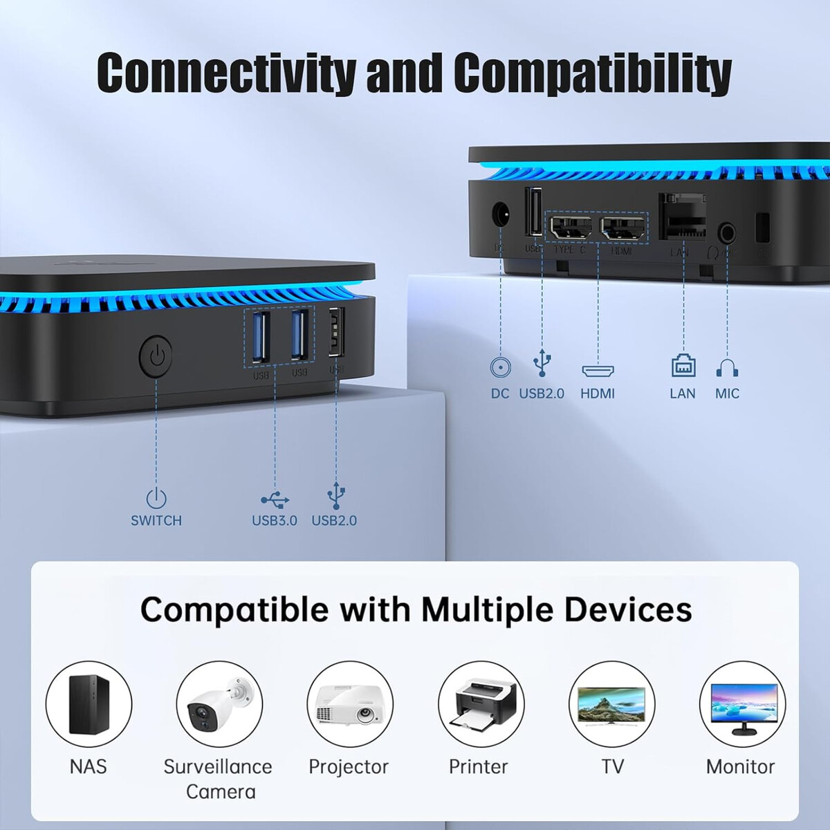 Co więcej, mini PC obsługuje Bluetooth 4.2 i WiFi 5, oferując płynną integrację bezprzewodową w różnych konfiguracjach.