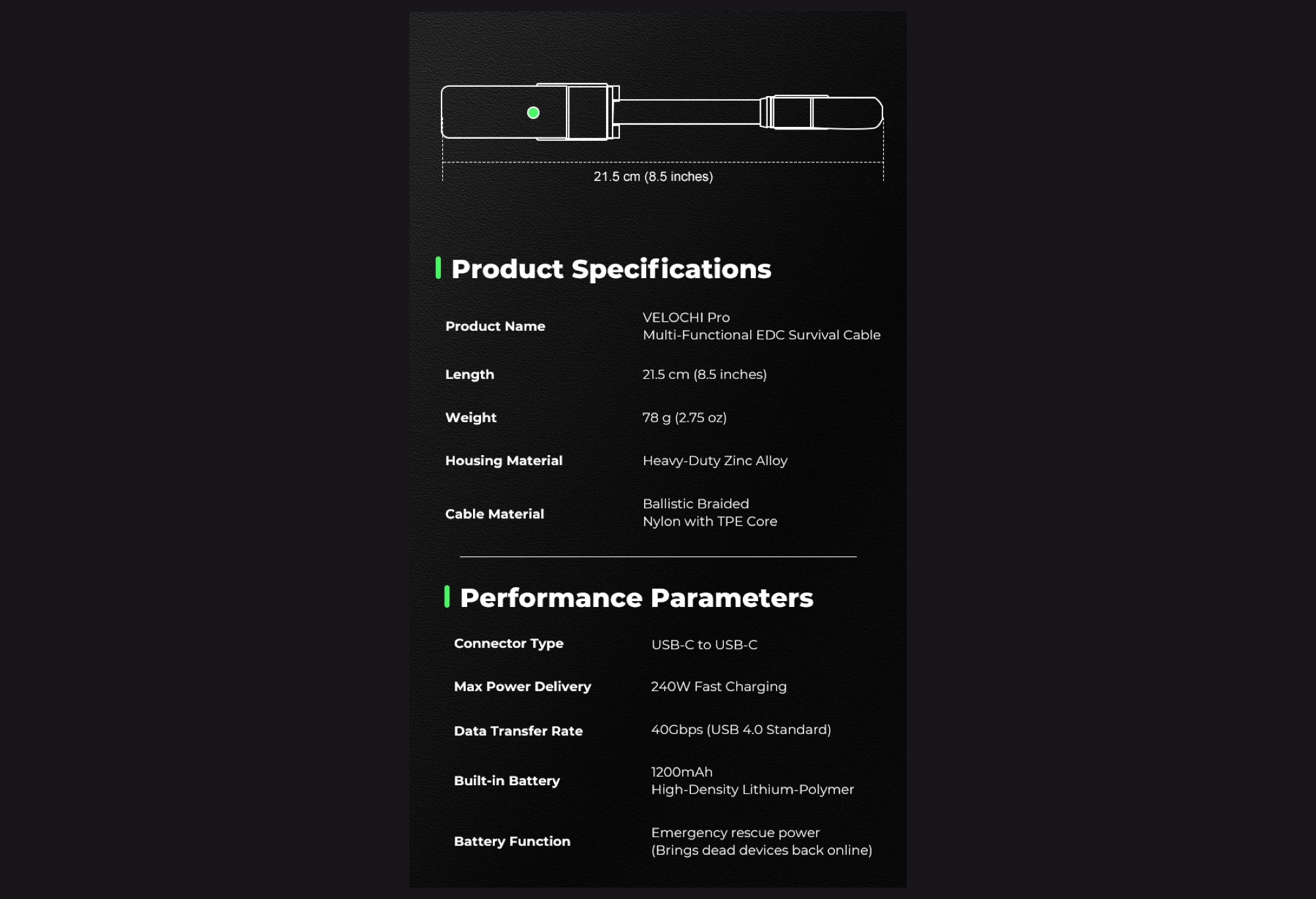 Velochi Pro jest sprzedawany jako gadżet do codziennego noszenia (EDC) dla entuzjastów technologii. Podczas gdy wiele narzędzi EDC łączy w sobie narzędzia takie jak noże, śrubokręty lub otwieracze do paczek, sercem Velochi Pro jest kabel USB-C do USB-C, który osiąga prędkość transmisji danych do 40 Gbit / s i może ładować urządzenia o mocy do 240 watów. Velochi Pro konkuruje tym samym z wysokiej jakości kablami USB-4(19,99 USD na Amazon).