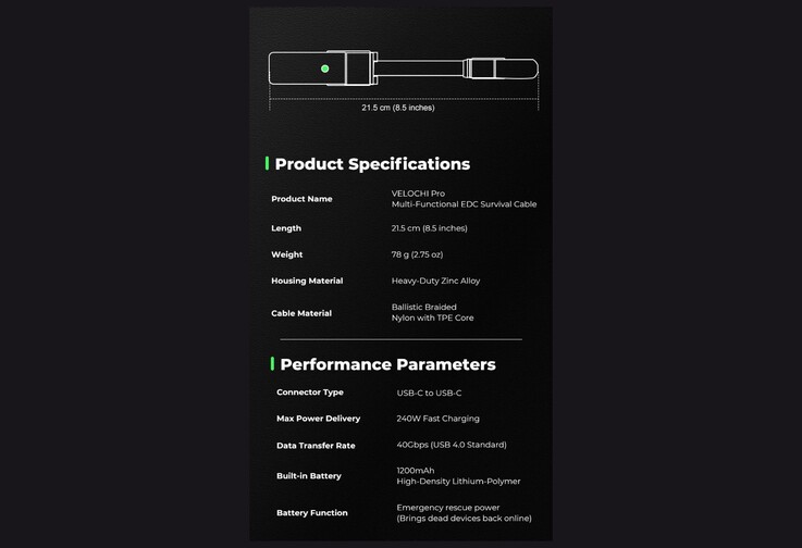 Zintegrowany power bank można zobaczyć na jednej połowie kabla o długości 21,5 centymetra. Chociaż ma on pojemność tylko 1200 mAh, jest to co najmniej wystarczające do naładowania smartfona w stopniu wystarczającym do wykonania połączenia alarmowego. Chociaż Velochi Pro jest sprzedawany jako narzędzie wielofunkcyjne 4 w 1, każdy z dwóch wariantów narzędzia oferuje tylko trzy funkcje. Poza kablem USB-C i power bankiem, w zestawie znajdziemy latarkę LED o jasności 40 lumenów lub zapalniczkę.
