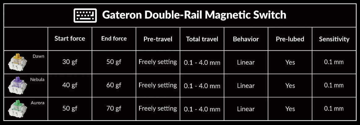 Lemokey, a sub-brand of Hong-Kong-based Keychron, has brought its newest L5 HE 8K magnetic switch custom gaming keyboard to the market. This is a wired keyboard with Hall effect magnetic switches (which are likely Gateron Double-Rail switches, also present in the Lemokey P1 HE) and an 8000 Hz polling and scan rate — bringing down the latency to just 0.125 milliseconds. It supports adjustable actuation points ranging from 0.01mm to 3.35mm, with a sensitivity of 0.01mm. The Double-Rails are generally well-regarded, and they come in three different variants - Dawn, Nebula, and Aurora (see below).