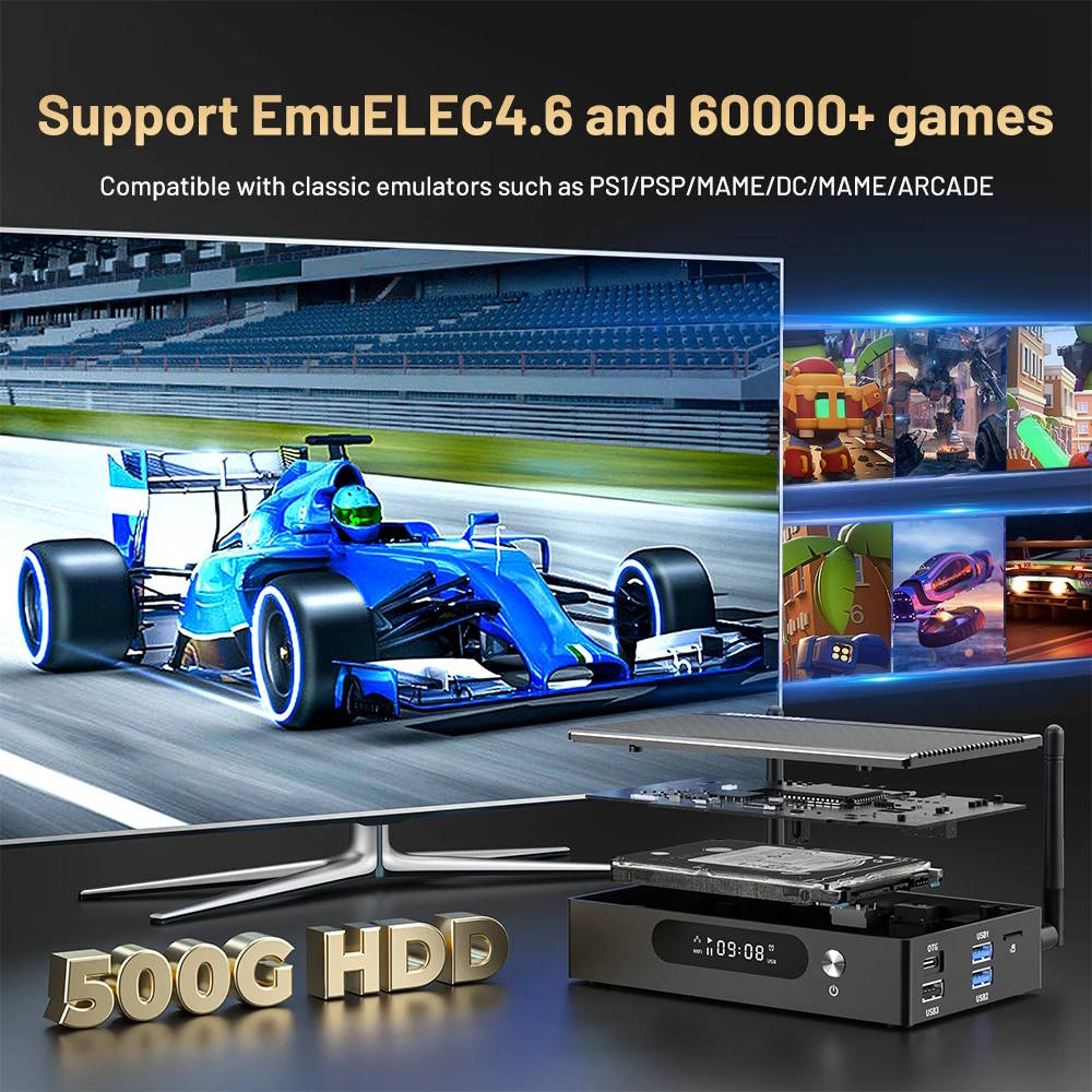 KinHank Super Console X3 Pro jest napędzany przez Amlogic S905X3 z czterema rdzeniami Cortex-A55 i 4 GB pamięci RAM. Ten niedrogi system do gier może działać na EmuELEC lub na Android 9 jako systemie operacyjnym, co oznacza, że to małe pudełko może być również używane jako odtwarzacz multimedialny dla starszych telewizorów, które nie mają dostępu do inteligentnych funkcji lub sklepu z aplikacjami.