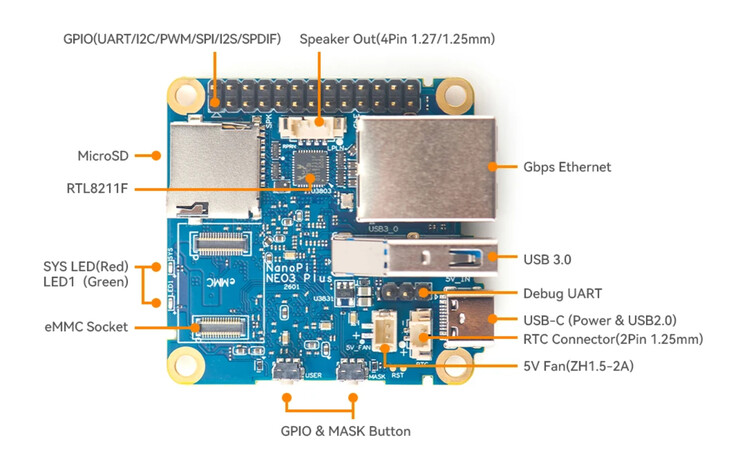 Co więcej, FriendlyElec dołączył złącza do podłączenia głośników stereo, a także złącze wentylatora 5V, debugowania UART i gniazdo eMMC. Płytka o wymiarach 48 x 48 mm i wadze 21,5 g zawiera również czerwone i zielone diody LED oraz 2-pinowe złącze RTC. Według wiki firmy https://wiki.friendlyelec.com/wiki/index.php/NanoPi_NEO3_Plusneo3 Plus obsługuje wiele forków Linus 6.1 LTS, w tym Debian 13 Core i Ubuntu Core 24.04.