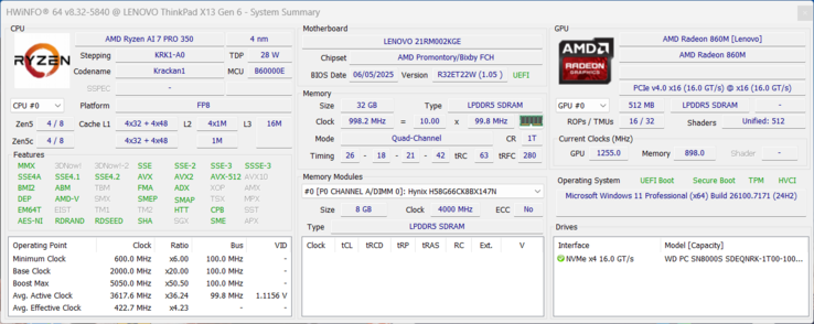Zgodnie z oficjalną specyfikacją Lenovo, ThinkPad X13 G6 jest dostępny z maksymalnie 32 GB pamięci RAM LPDDR5x-8000, której nie można rozszerzyć.