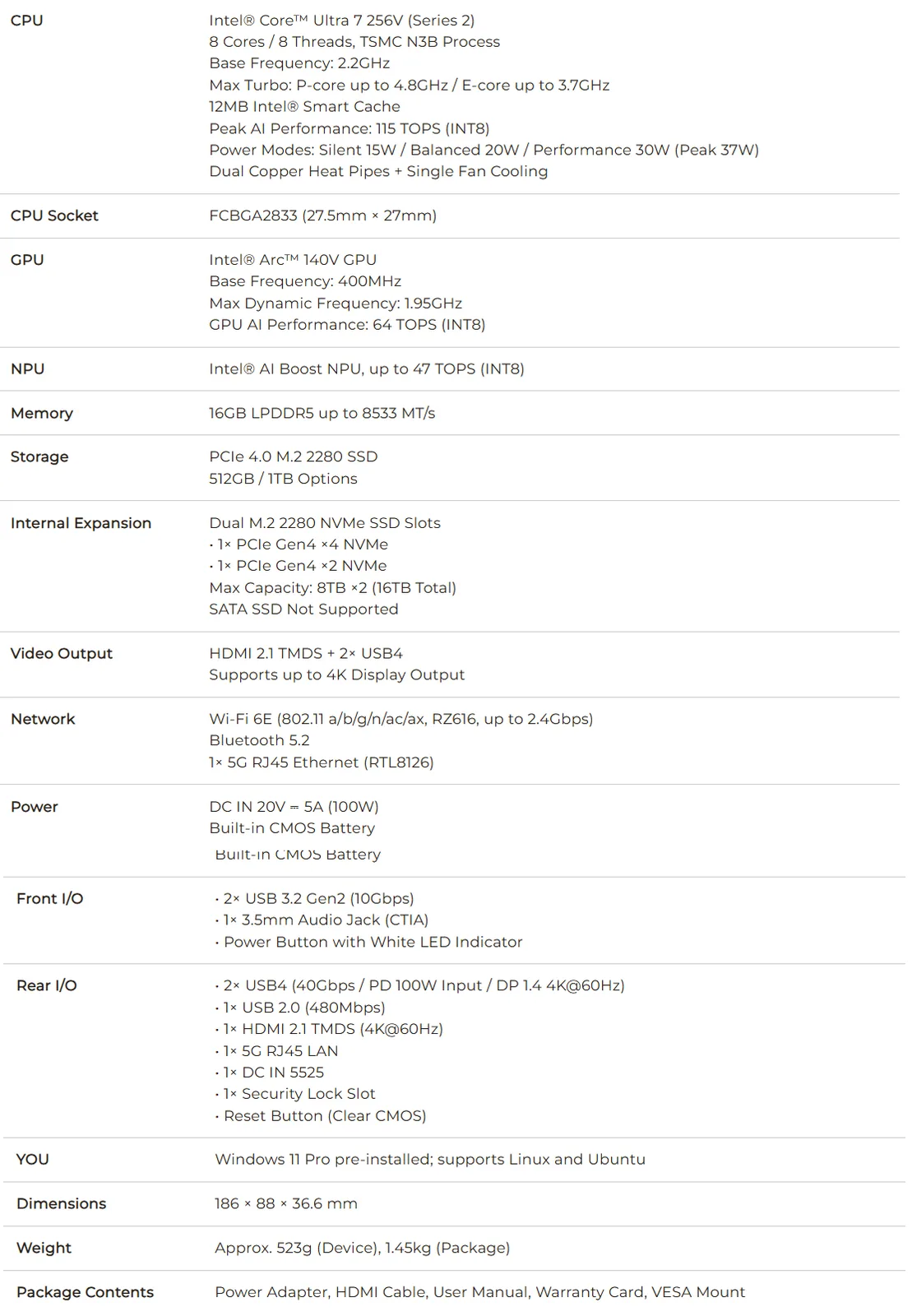 Pod maską tego małego mini PC znajduje się Intel Core Ultra 7 256V, procesor wyższej klasy średniej z linii Lunar Lake. Wyposażony jest w iGPU Arc 140V iGPU, który może płynnie obsługiwać dużą liczbę nowoczesnych gier w rozdzielczości 1080p z poprawkami w ustawieniach wizualnych.