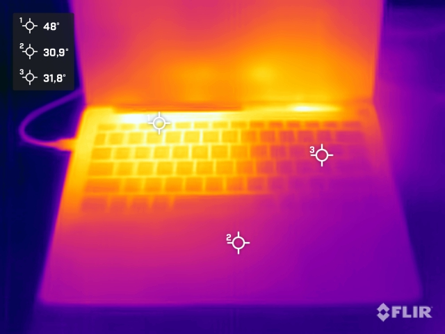 (+) Podpórki pod nadgarstki i touchpad są chłodniejsze niż temperatura skóry i maksymalnie 29.8 °C / 85.6 F i dlatego są chłodne w dotyku.