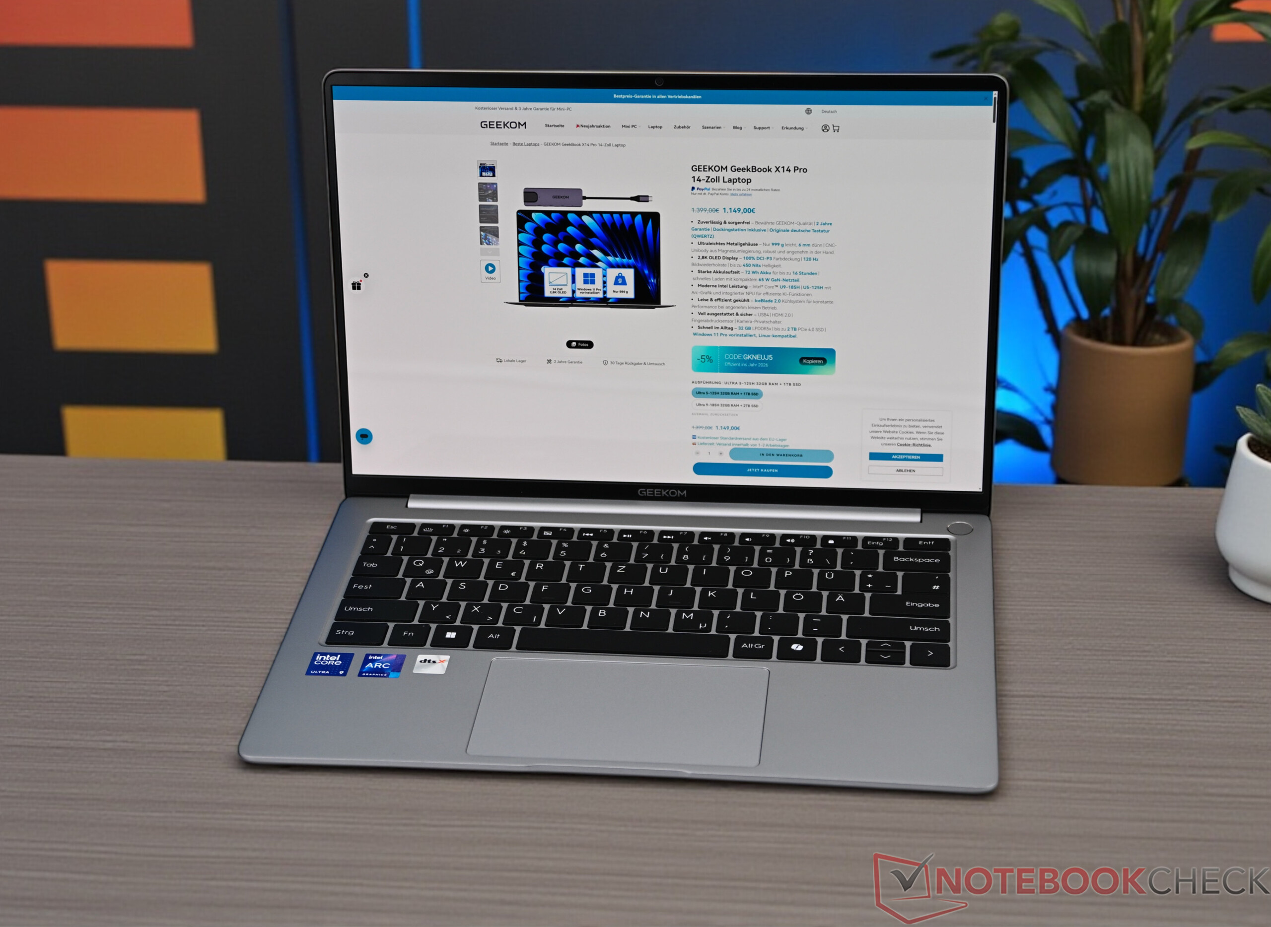 Wraz z GeekBook X14 Pro i większym GeekBook X16 Pro, Geekom, producent znany wcześniej głównie z mini PC, po raz pierwszy rozszerza swoje portfolio o notebooki. Nasz test skupia się na bardziej kompaktowym 14-calowym modelu, który w topowej konfiguracji wyposażony jest w procesor Intel Core Ultra 9 185H, 32 GB pamięci RAM i dysk SSD o pojemności 2 TB. Sugerowana cena detaliczna wynosi 1599 euro, choć Geekom często oferuje swoje urządzenia ze zniżką. Tańsza wersja z Intel Core Ultra 5 125H, również 32 GB RAM i 1 TB SSD, zaczyna się od około 1399 euro.