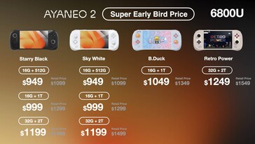 Lista konfiguracji sprzętowych do wyboru zaczyna się od 16/512 GB pamięci/pamięci i idzie aż do 32 GB/2 TB, które są dostępne tylko dla AYANEO 2. Jednak ta konfiguracja sprzętowa jest dostarczana za pośrednictwem dwóch wyborów kolorystycznych i każdy ma inną cenę: 1499 USD za Sky White oraz 1599 USD za design Retro Power. Na szczęście oferta Super Early Bird Price obniża powyższe ceny o 300 USD. Z drugiej strony, najtańsze konfiguracje otrzymują tylko 150 USD zniżki (799 USD z 949 USD za 16/512 GB AYANEO GEEK i 949 USD z 1 099 USD za 16/512 GB AYANEO 2).