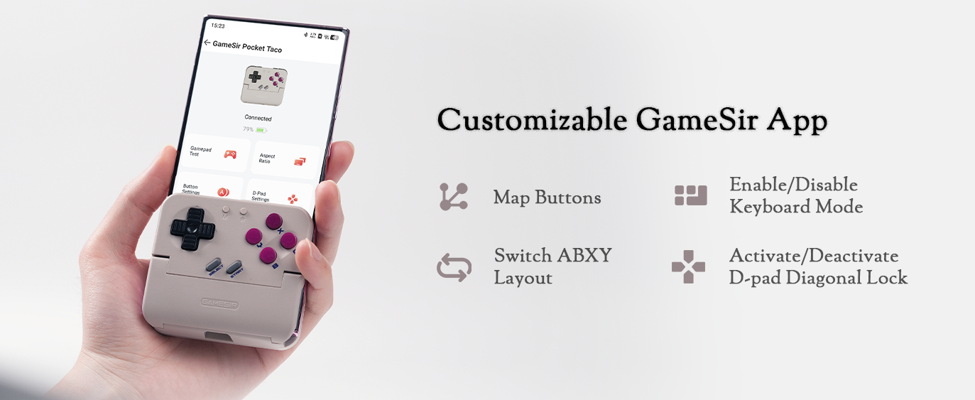 Kontroler współpracuje z aplikacją GameSir, która daje użytkownikom garść opcji personalizacji, takich jak dostosowanie proporcji/skalowania wyświetlacza, modyfikacja układu przycisków (Switch lub Xbox), zamiana klawiszy L1 i L2 lub R1 i R2, włączenie blokady przekątnej D-pada i aktywacja trybu klawiatury.