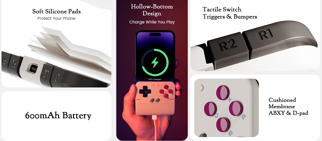 GameSir Pocket Taco waży 62,2 grama i posiada wbudowaną baterię o pojemności 600 mAh, która powinna zapewnić wiele godzin rozgrywki. Kontroler ma również wydrążony spód, który pasuje do portu telefonu, umożliwiając podłączenie kabla ładującego, dzięki czemu można ładować podczas gry.