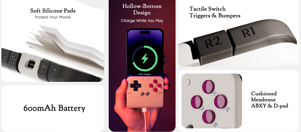 GameSir Pocket Taco łączy się z kompatybilnym smartfonem przez Bluetooth i mocuje do urządzenia za pomocą mechanizmu zaciskowego. Wnętrze kontrolera jest wyłożone miękkimi silikonowymi podkładkami, które chronią telefon. Kontroler wyposażony jest w membranowy D-pad i przyciski ABXY, a spusty i bumpery posiadają dotykowe przełączniki.