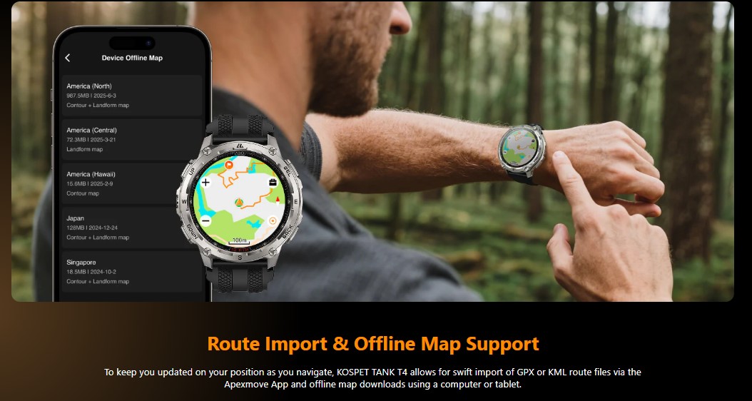 Jak zwykle zainstalowano czujniki optyczne, które służą nie tylko do pomiaru tętna, ale także nasycenia tlenem. EKG nie jest obsługiwane, ale monitorowanie snu jest na pokładzie. Co więcej, Kospet Tank M4 jest wyposażony w głośnik i mikrofon, dzięki czemu może być używany jako urządzenie głośnomówiące Bluetooth, a także ma funkcję walkie-talkie z ograniczonym zasięgiem do 40 metrów. Żywotność baterii określono na 15 dni w typowym użytkowaniu lub do 22 godzin w trybie GPS. Wreszcie, zegarek jest wodoodporny do ciśnienia testowego 10 ATM