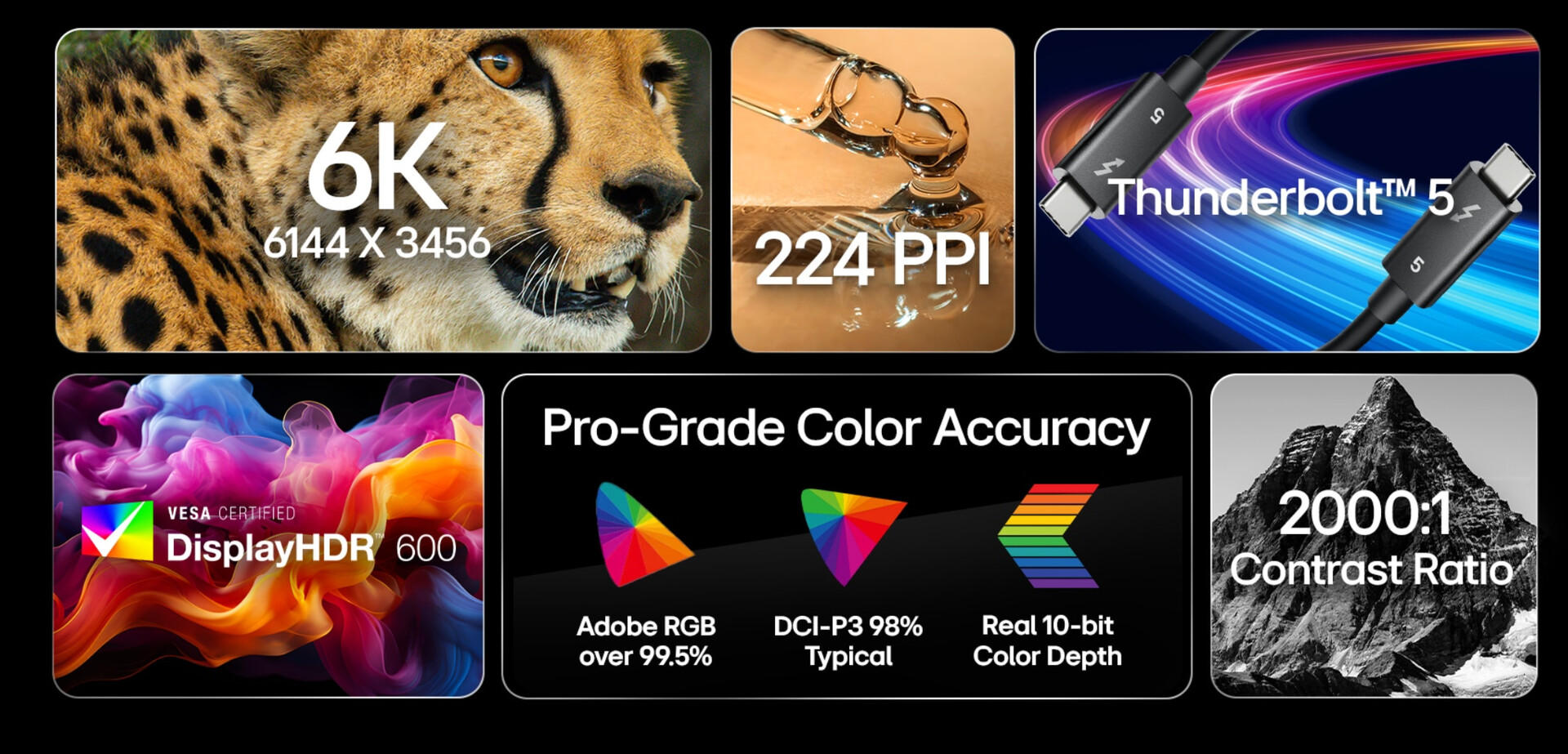 Przypominający monitor Apple Studio Display (obecnie 1,699 USD na Amazon), UltraFine 32U990A wyświetla 6,144 x 3,456 pikseli na 31,5-calowym panelu IPS, zapewniając gęstość pikseli 224 PPI. Ponadto monitor zapewnia 98% pokrycie przestrzeni barw DCI-P3 i 99,5% AdobeRGB przy szczytowej jasności 450 nitów SDR i 600 nitów HDR. Niestety, LG ogranicza częstotliwość odświeżania monitora do 60 Hz, co często ma miejsce w przypadku monitorów profesjonalnych, w których wierność wizualna jest ceniona bardziej niż szybkość obrazu.
