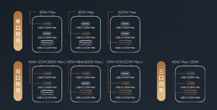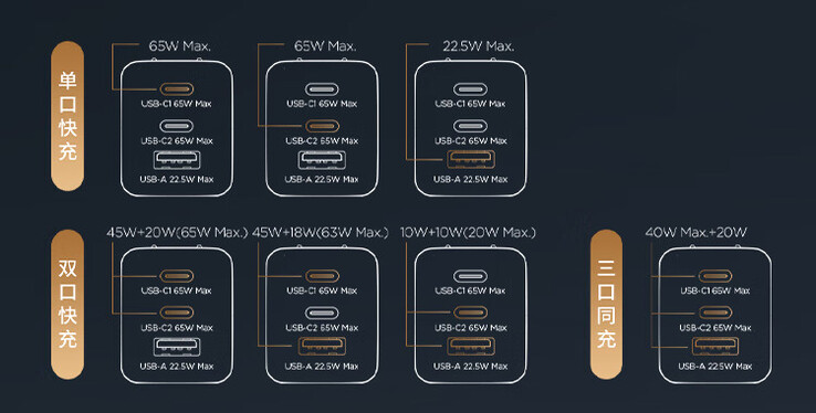 Dwa porty USB typu C tej ładowarki GaN mogą dostarczyć do 65 watów mocy, podczas gdy port typu A osiąga maksymalną moc 22,5 wata. W przypadku korzystania z trzech z nich jednocześnie, otrzymają Państwo łącznie 40 watów mocy z portów typu C, podczas gdy port typu A będzie oferował 20 watów.
