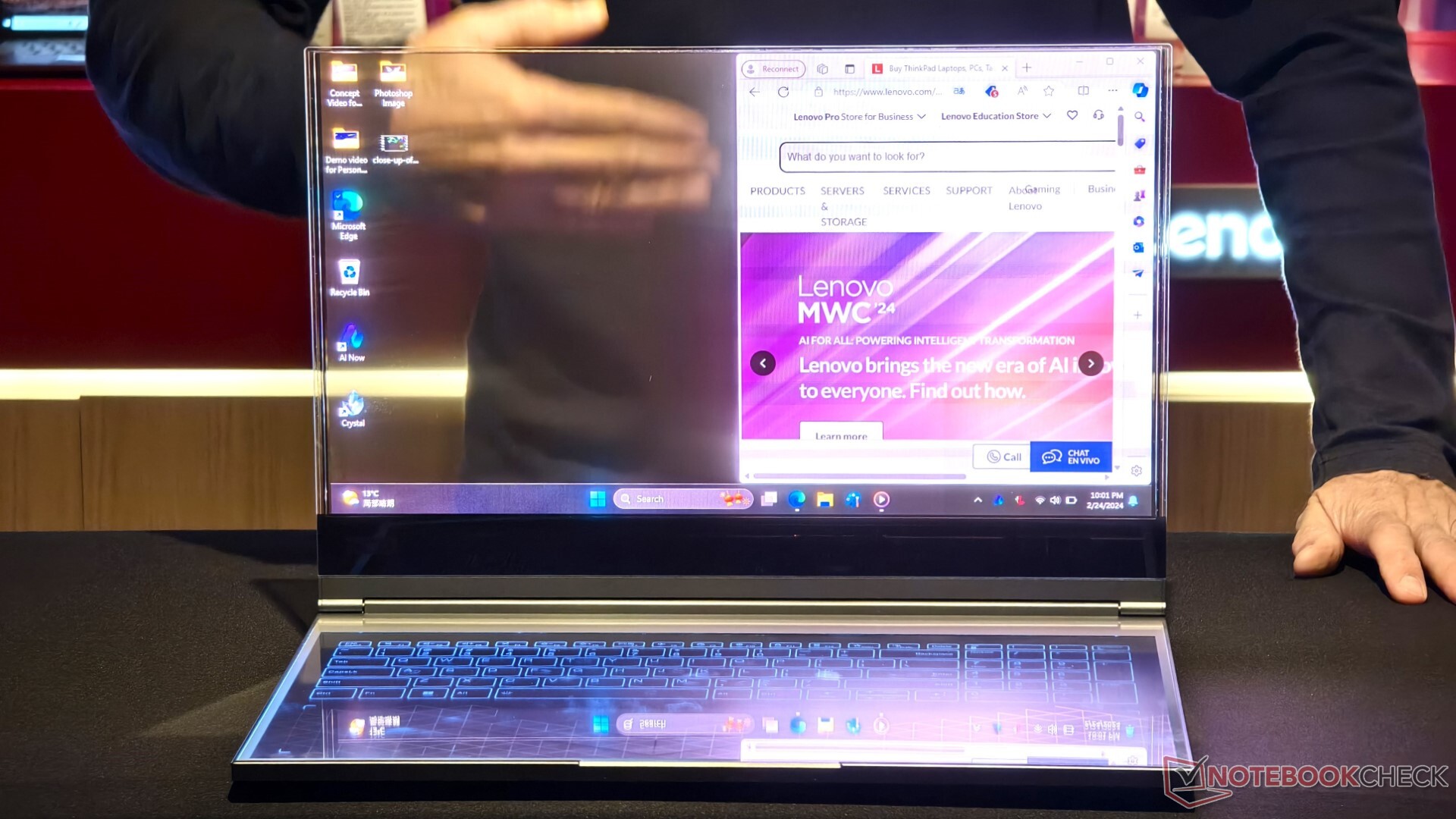 Innymi słowy, jest mało prawdopodobne, aby Lenovo kiedykolwiek wypuściło laptop ThinkBook Transparent Display w formie pokazanej dzisiaj na MWC 2024. Niemniej jednak, mieliśmy okazję wypróbować działający prototyp podczas prezentacji produktów Lenovo w Barcelonie. Podczas gdy ThinkBook Transparent Display Laptop wygląda na smukły i lekki, jego 17,3-calowy wyświetlacz przyczynia się do tego, że urządzenie ma szacunkową wagę od 3 kg do 4 kg.