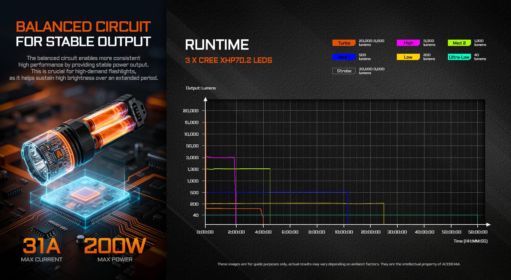 To powiedziawszy, Acebeam X30 może utrzymać szczytową jasność trzech diod LED 6500K tylko przez bardzo krótki czas. Przy pełnej baterii, 20 000 lumenów i zasięg ponad 650 metrów są dostępne przez zaledwie 15 sekund. Po tym czasie, tryb wysoki zapewnia 3000 lumenów i zasięg 185 metrów przez 1 godzinę i 50 minut. Jeśli tryb turbo nie zostanie użyty wcześniej, tryb ten będzie działał o 5 minut dłużej.